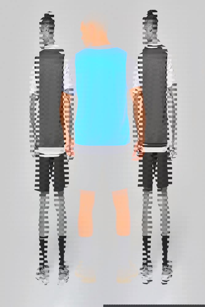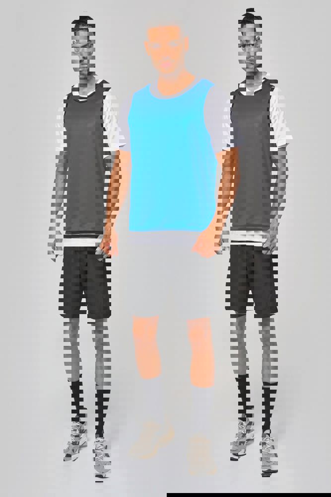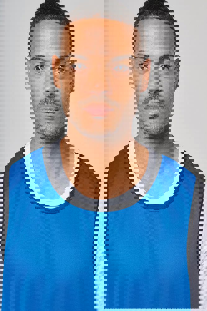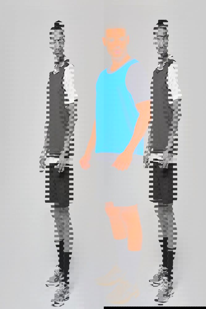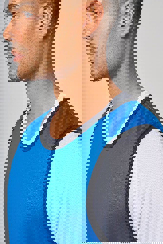100% poliestere. 2 strati cuciti da 160 g/m² ciascuno. Sbiechi elastici a contrasto e rinforzati sul collo, giromanica e fondo capo per una migliore resistenza alla trazione.