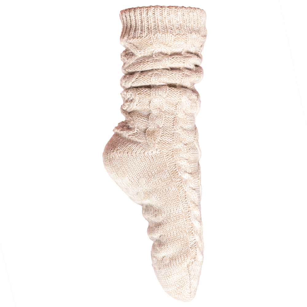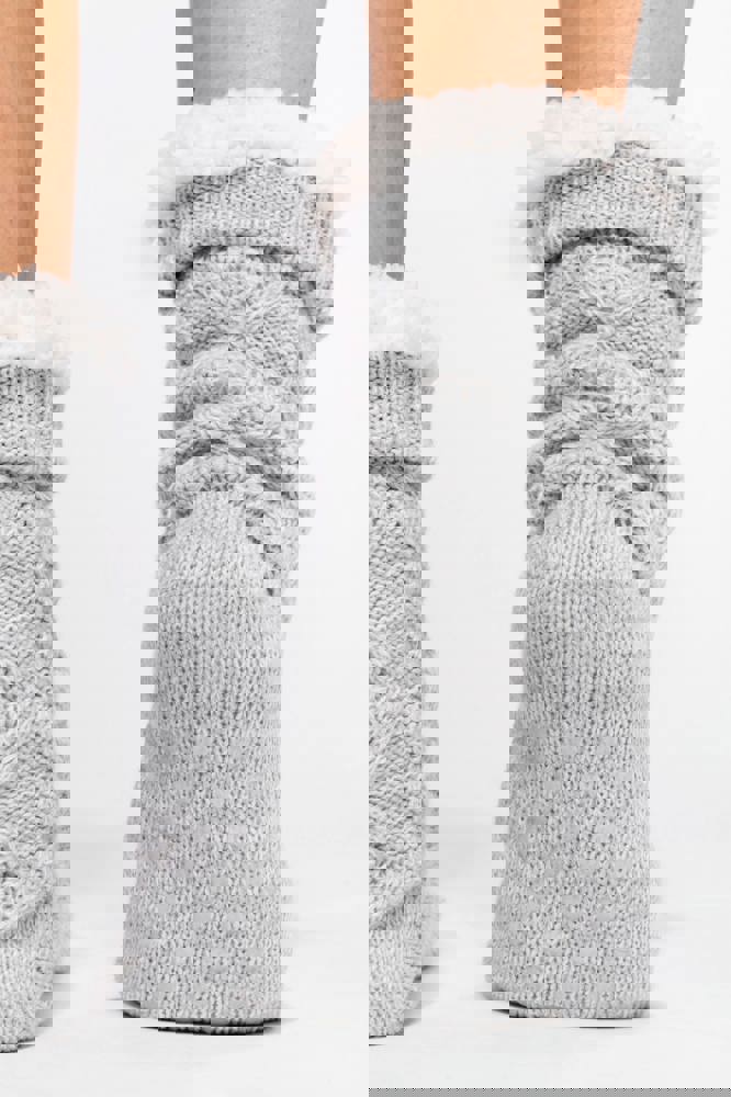 Esterno: 100% acrilico. Interno: 100% poliestere. Calde calze da casa, foderate in Sherpa. Tacchetti antiscivolo sotto la suola. Effetto "lavorato a mano" con lavorazione ritorta. Altezza 27 cm.