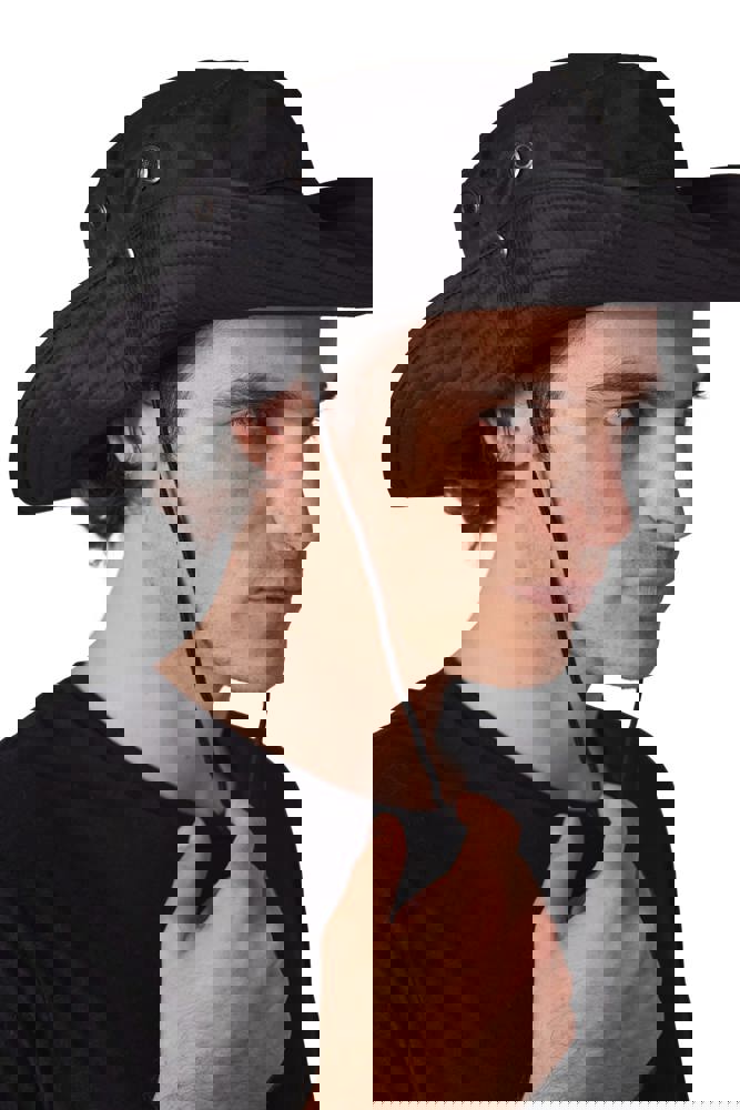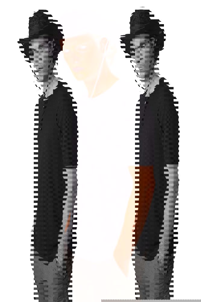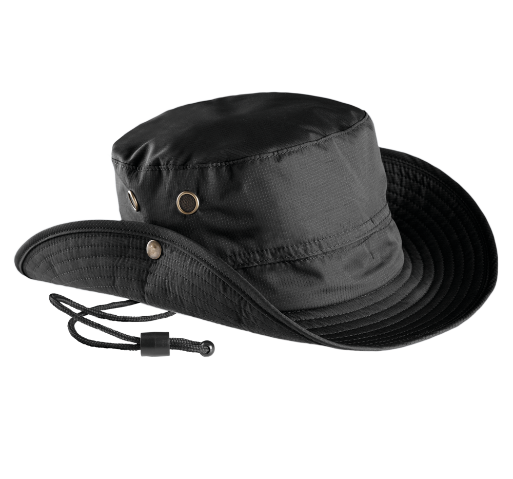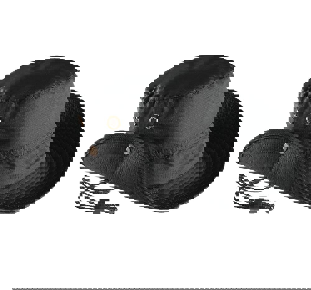 100% Poliestere in tessuto rivestito e resistente all'acqua. Falda flessibile e pieghevole grazie a bottoni a pressione. Occhielli di ventilazione, cordoncino regolabile con stopper. Disponibile in 2 taglie.