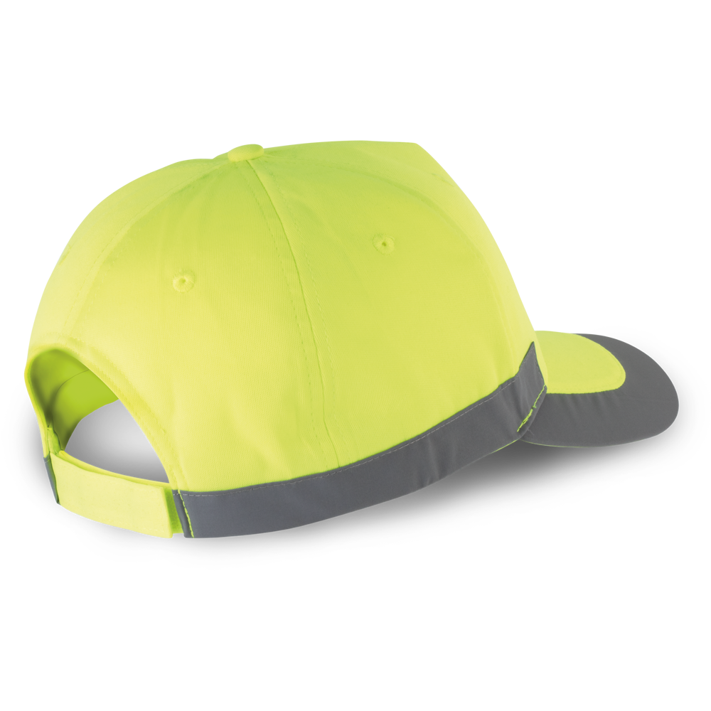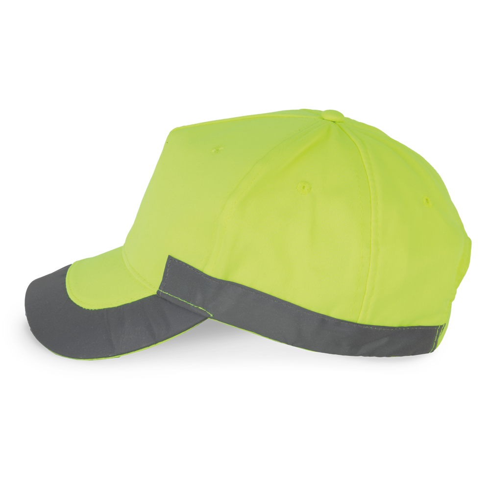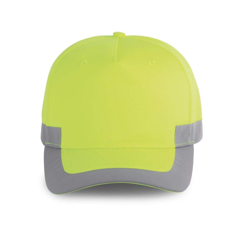 100% Poliestere. Cappellino 5 pannelli laminati, fluorescente. Chiusura regolabile con Velcro.