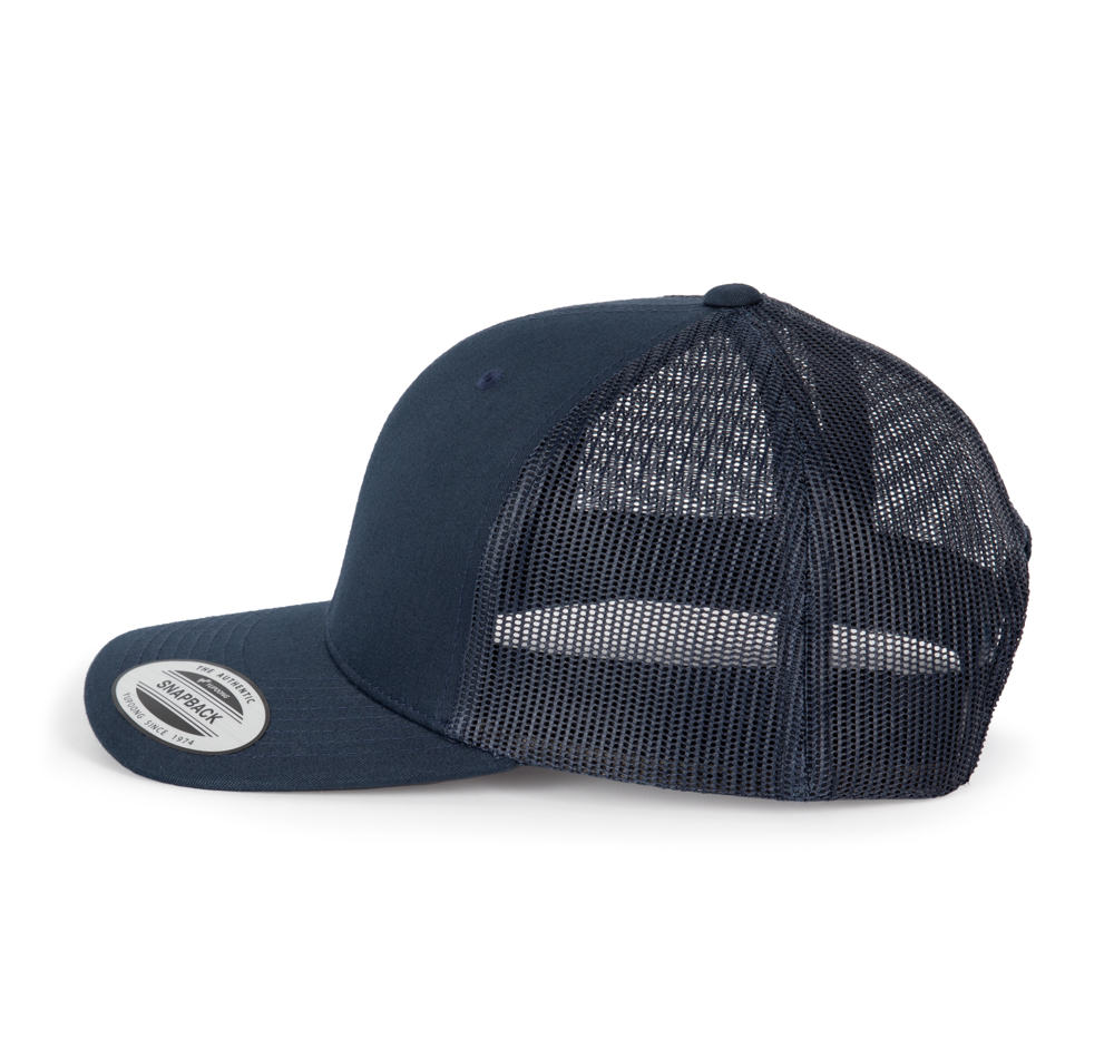 60% cotone / 40% poliestere. 6 pannelli. Modello Trucker rétro di alta qualità con visiera a profilo medio e pannelli anteriori rigidi dello stesso colore. Chiusura regolabile in plastica.