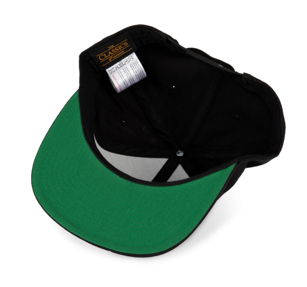80% acrilico / 20% lana. 6 pannelli. Modello classico di prima scelta. Visiera piatta, profilo alto, pannelli anteriori rigidi. Superficie inferiore della visiera a contrasto di colore verde. Chiusura regolabile in plastica.
