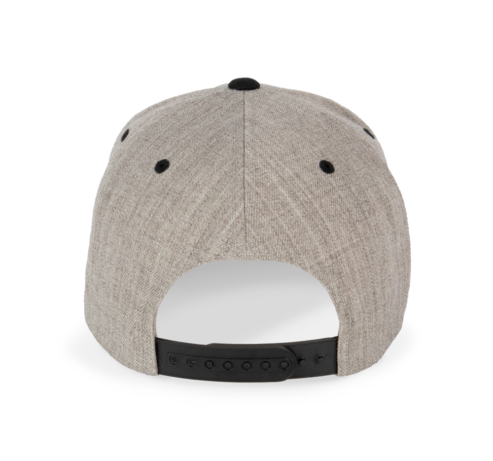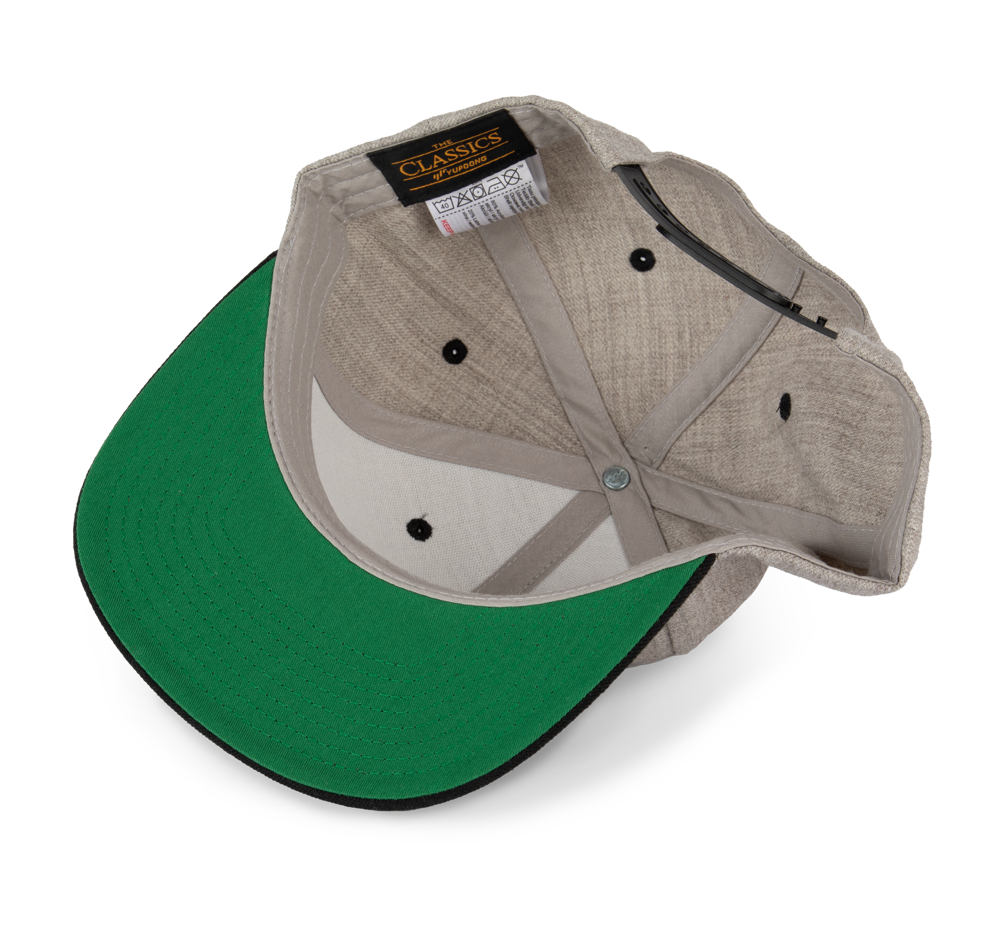 80% acrilico / 20% lana. 6 pannelli. Modello classico di prima scelta. Visiera piatta, profilo alto, pannelli anteriori rigidi. Superficie inferiore della visiera a contrasto di colore verde. Chiusura regolabile in plastica.