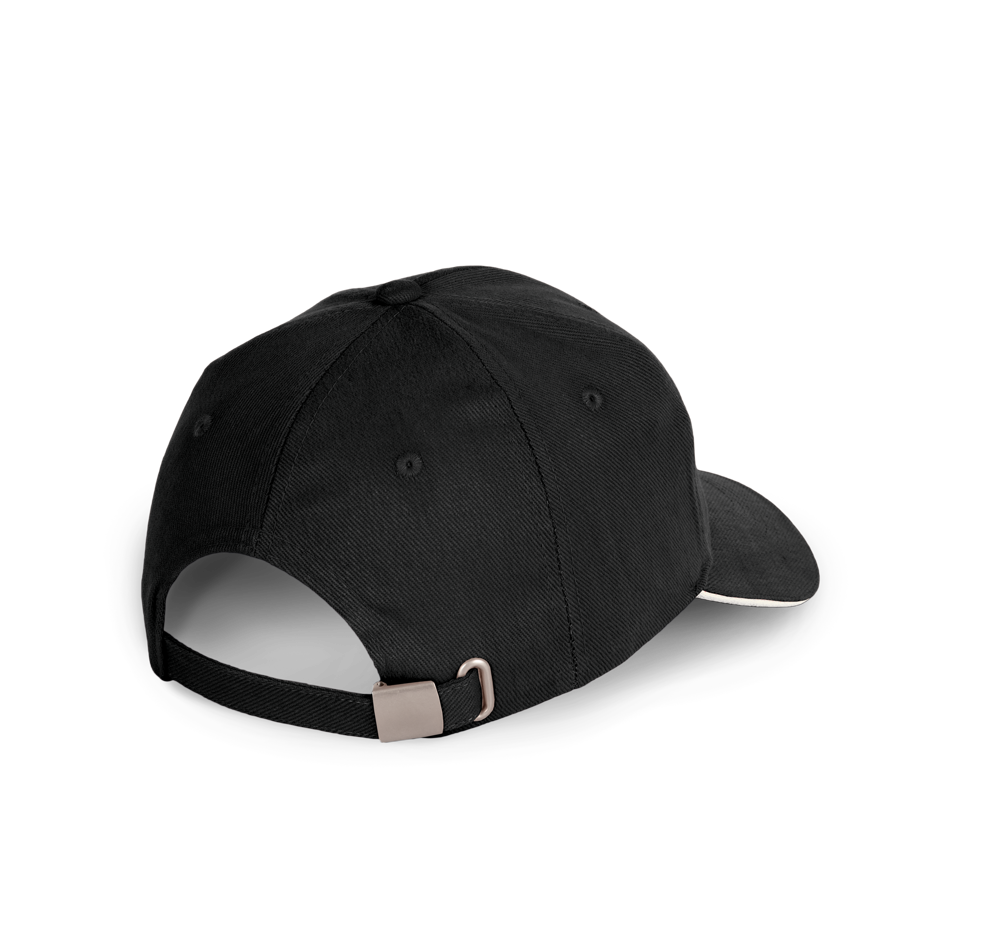 100% cotone biologico. Cappellino 6 pannelli con visiera sandwich con colori a contrasto. Chiusura regolabile con fibbia metallica.
