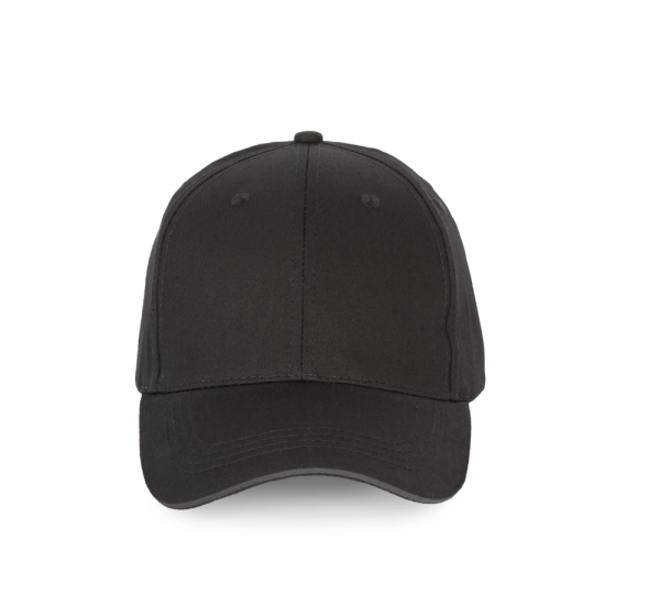 100% cotone. Cappellino 6 pannelli con visiera sandwich a contrasto. Chiusura regolabile tramite fibbia di metallo e passante autobloccante.