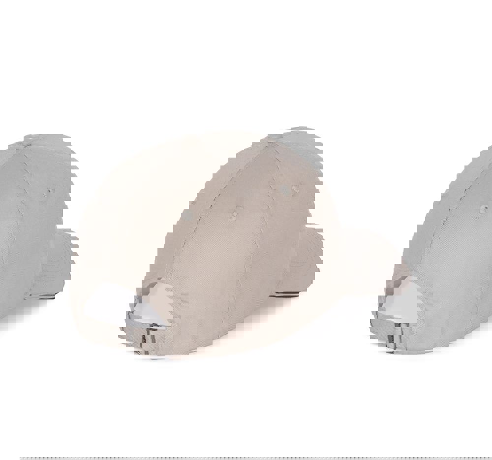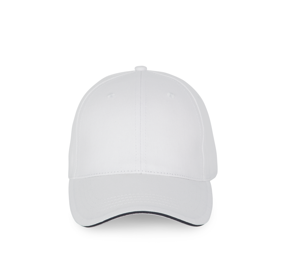100% cotone. Cappellino 6 pannelli con visiera sandwich a contrasto. Chiusura regolabile tramite fibbia di metallo e passante autobloccante.
