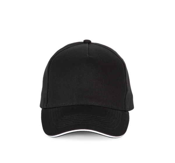 100% cotone. Cappellino a 5 pannelli. Chiusura regolabile tramite fibbia di metallo e passante autobloccante.