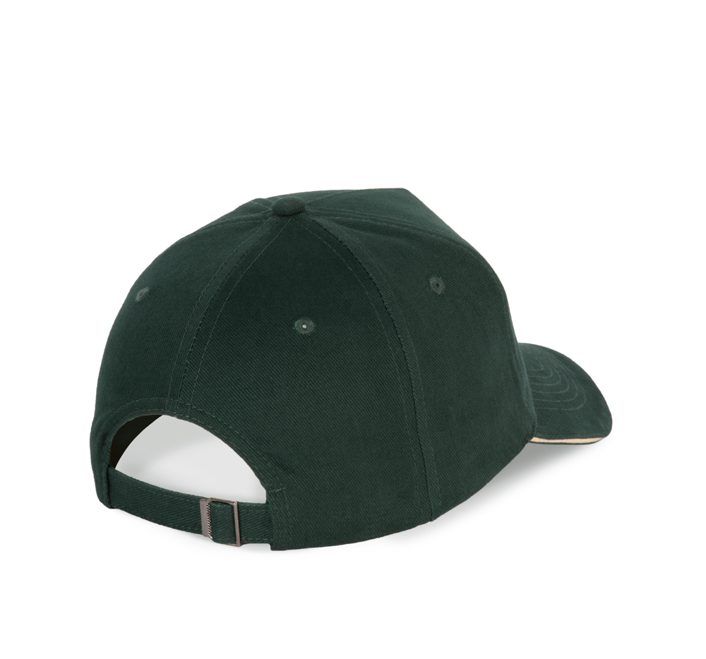 100% cotone. Cappellino a 5 pannelli. Chiusura regolabile tramite fibbia di metallo e passante autobloccante.