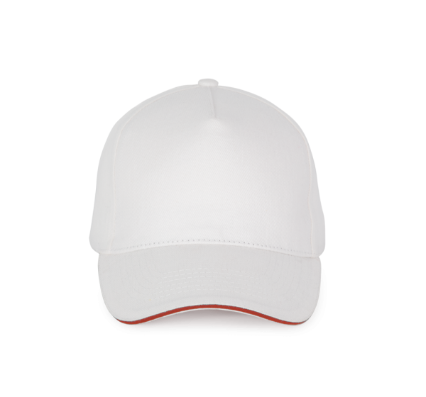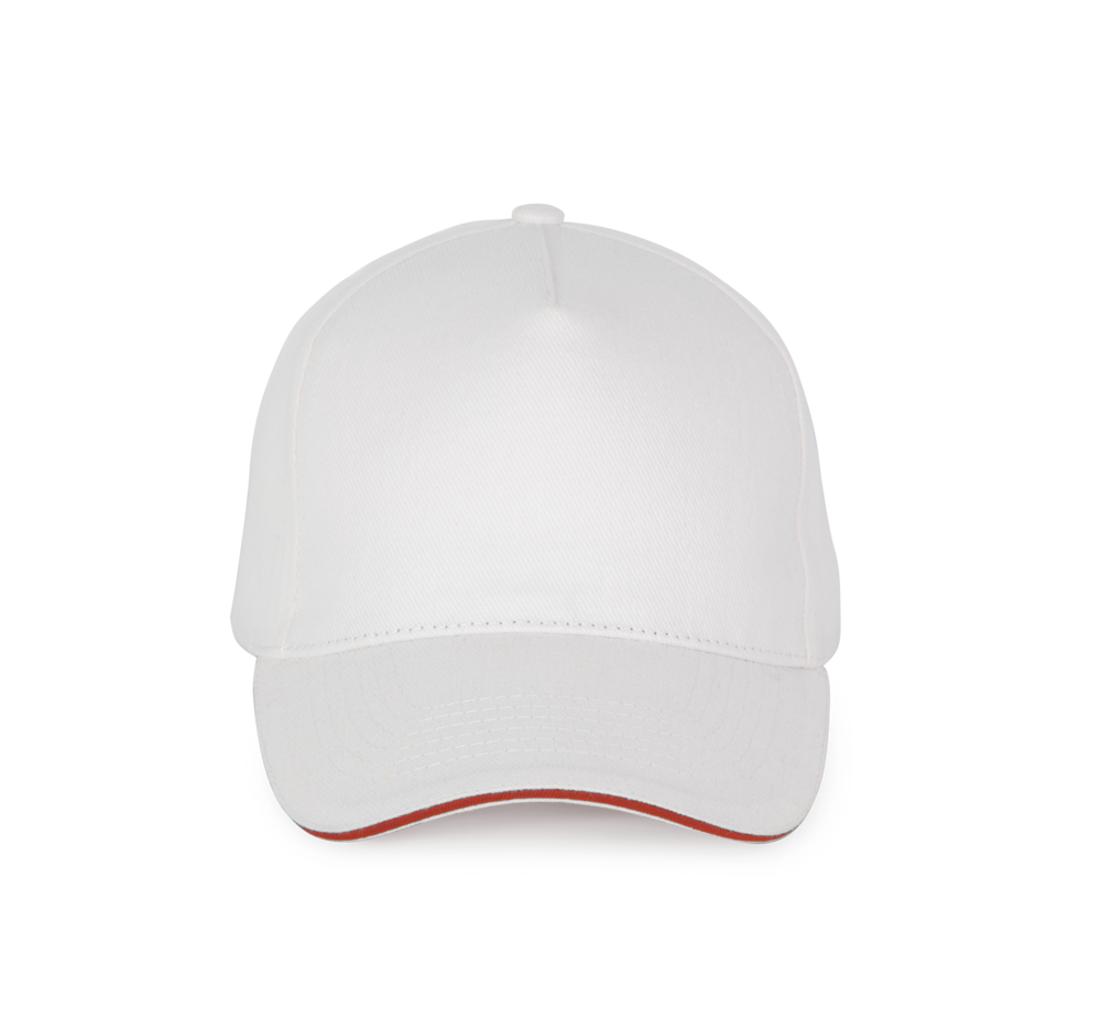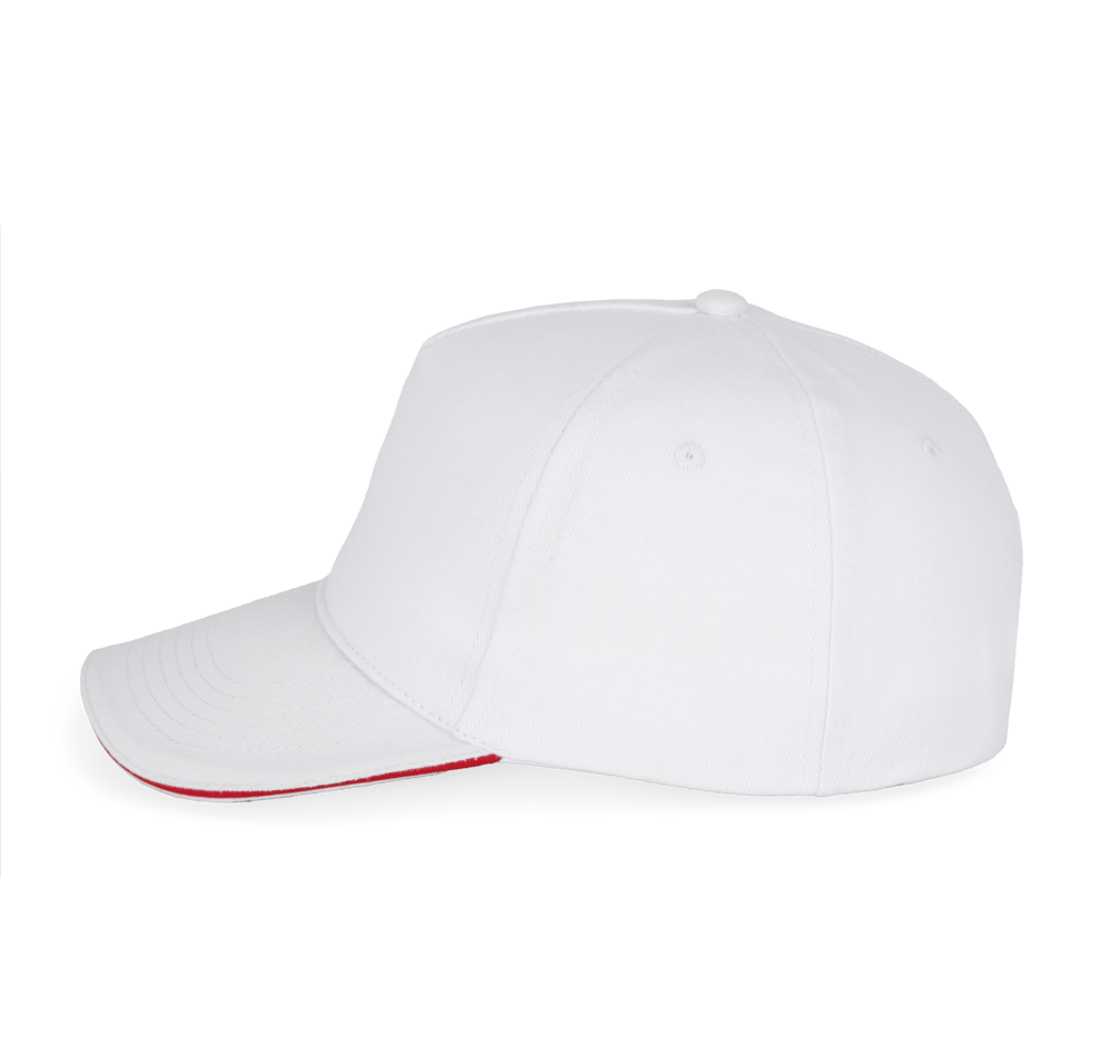 100% cotone. Cappellino a 5 pannelli. Chiusura regolabile tramite fibbia di metallo e passante autobloccante.