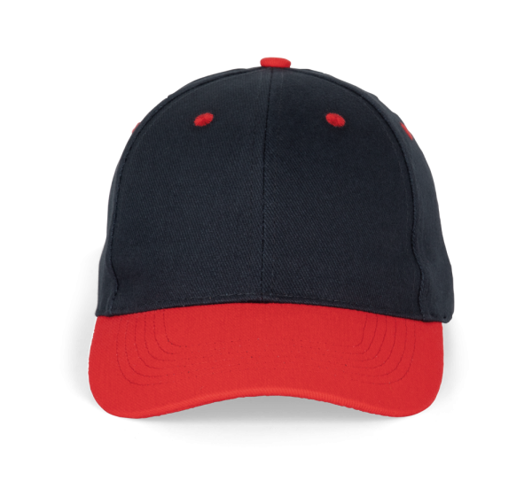 100% cotone. Cappellino a 6 pannelli. Chiusura regolabile tramite fibbia di metallo e passante autobloccante.