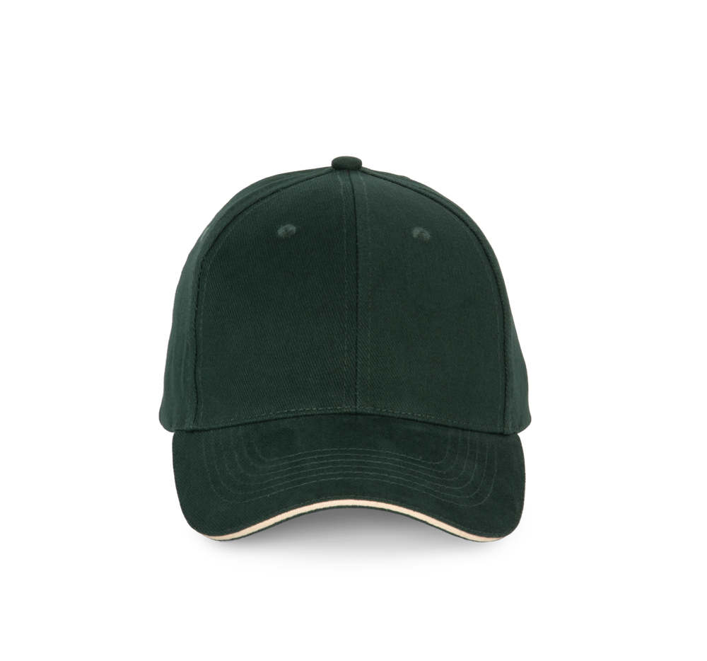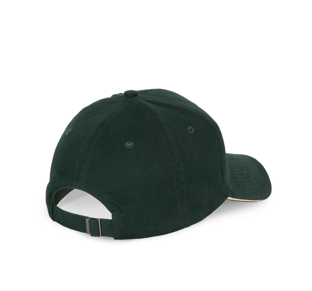 100% cotone. Cappellino 6 pannelli con visiera sandwich a contrasto. Chiusura regolabile tramite fibbia di metallo e passante autobloccante.
