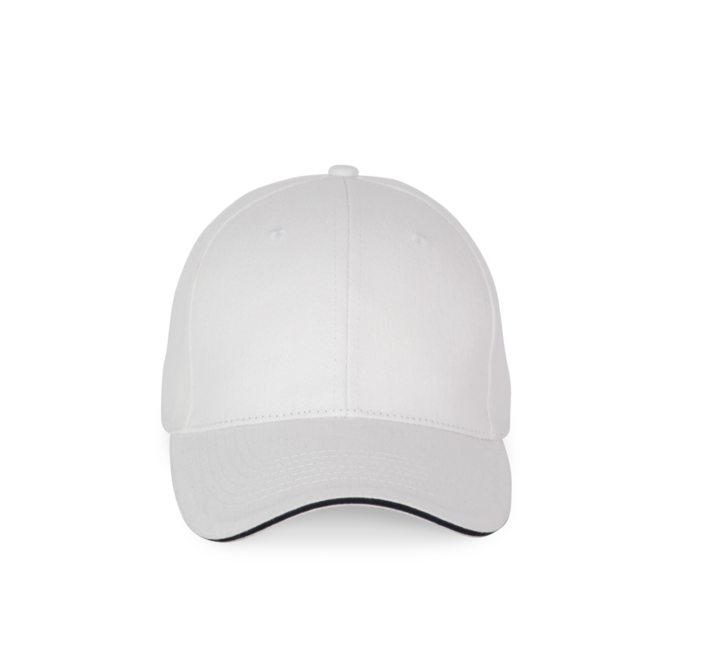100% cotone. Cappellino 6 pannelli con visiera sandwich a contrasto. Chiusura regolabile tramite fibbia di metallo e passante autobloccante.