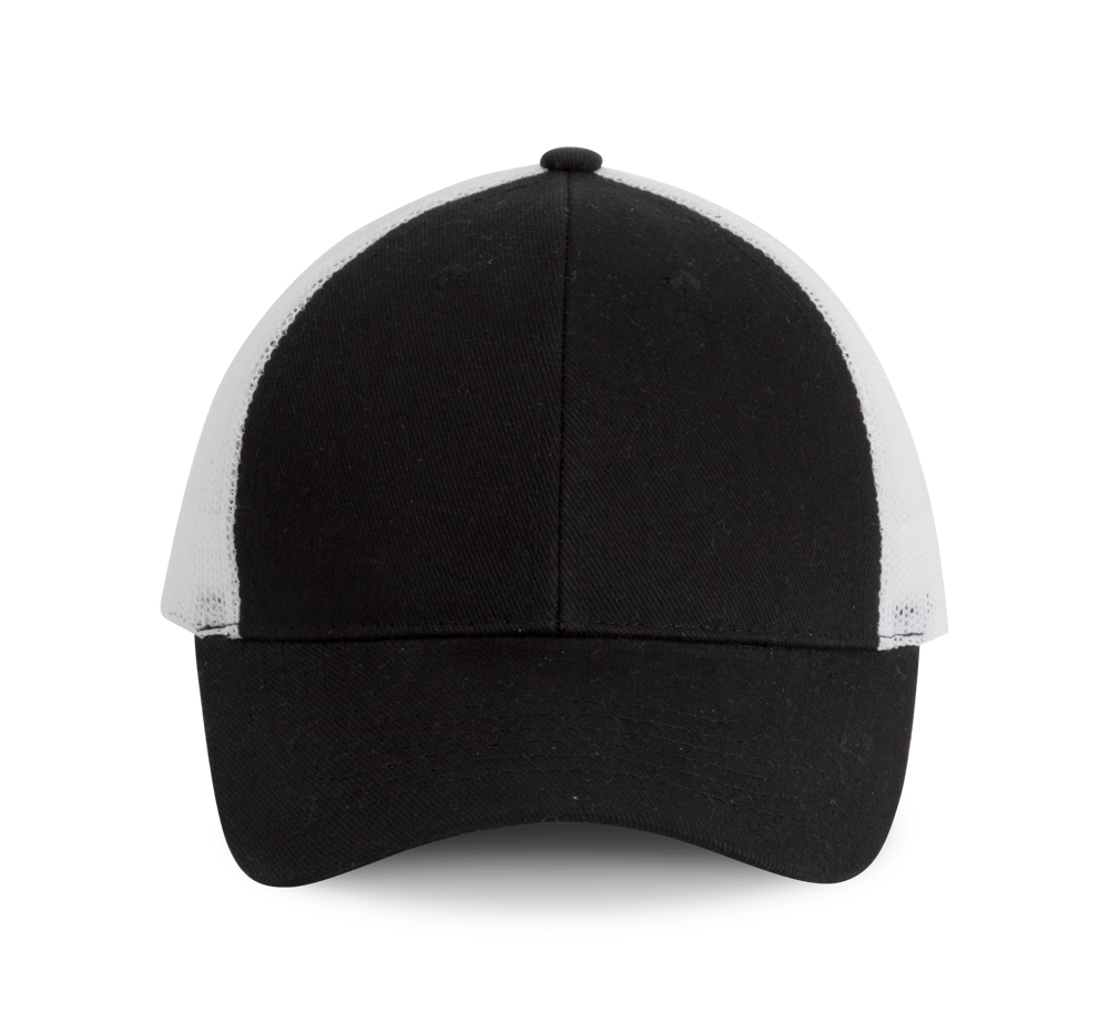 100% cotone / 100% poliestere. Cappellino 6 pannelli modello trucker. Pannelli frontali e visiera in cotone, rete in poliestere. Chiusura regolabile con linguetta in plastica.