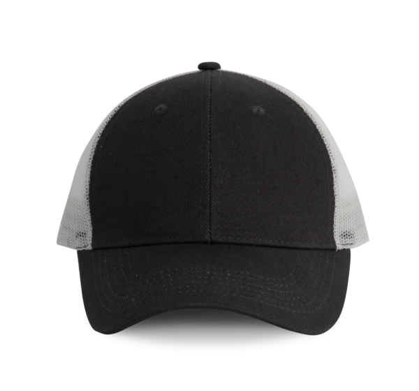 100% cotone / 100% poliestere. Cappellino 6 pannelli modello trucker. Pannelli frontali e visiera in cotone, rete in poliestere. Chiusura regolabile con linguetta in plastica.