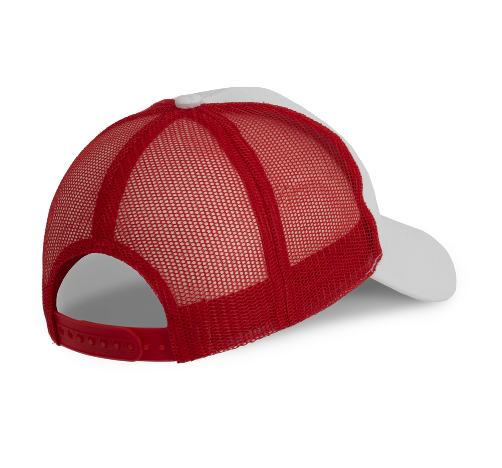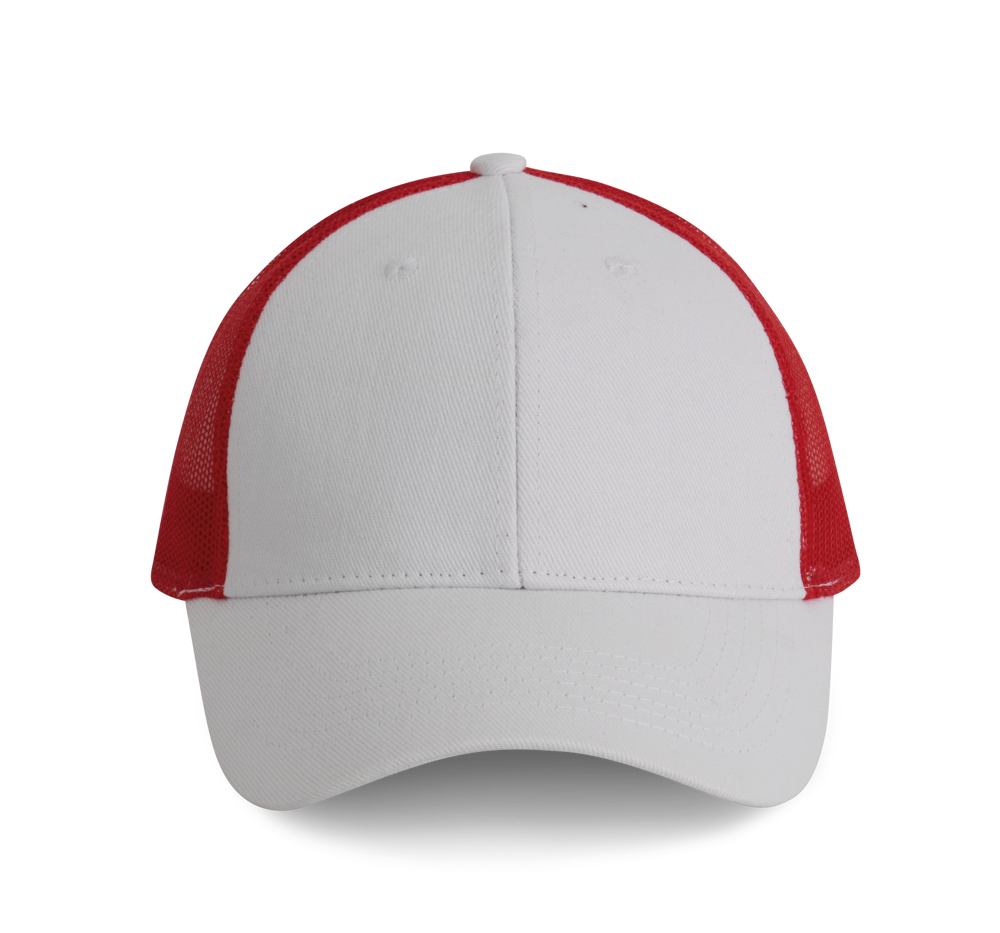 100% cotone / 100% poliestere. Cappellino 6 pannelli modello trucker. Pannelli frontali e visiera in cotone, rete in poliestere. Chiusura regolabile con linguetta in plastica.