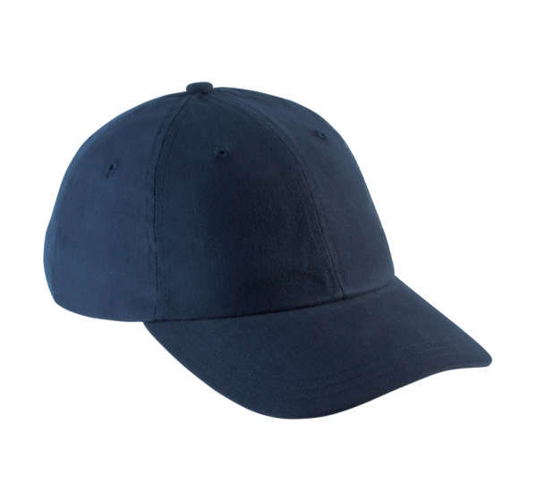 100% cotone spesso pettinato. 6 pannelli. Visiera a profilo basso. Chiusura sul retro con fibbia metallica.