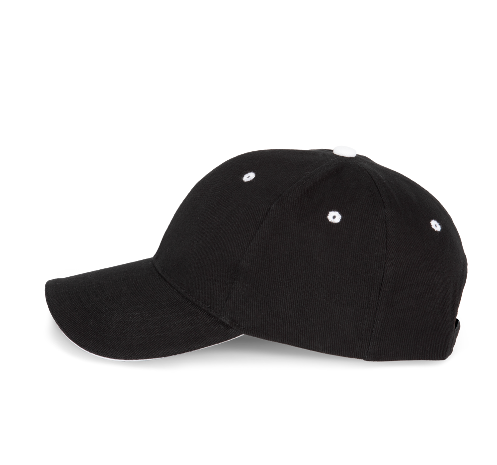 100% cotone twill spazzolato. 6 pannelli. Visiera pre-formata. Taglia regolabile con chiusura in metallo e passante. *3 varianti con contrasto colore sotto la visiera.