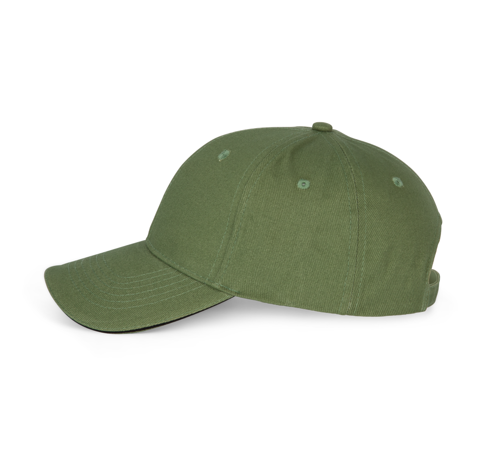 100% cotone twill spazzolato. 6 pannelli. Visiera pre-formata. Taglia regolabile con chiusura in metallo e passante. *3 varianti con contrasto colore sotto la visiera.