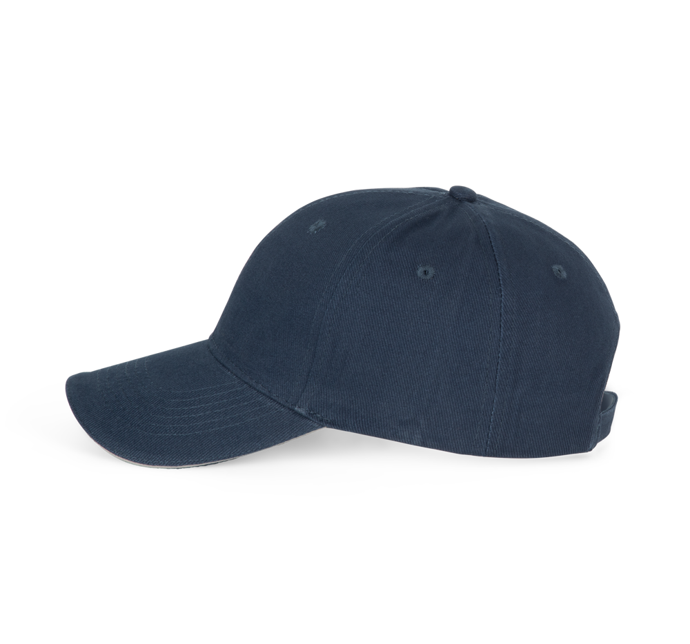 100% cotone twill spazzolato. 6 pannelli. Visiera pre-formata. Taglia regolabile con chiusura in metallo e passante. *3 varianti con contrasto colore sotto la visiera.