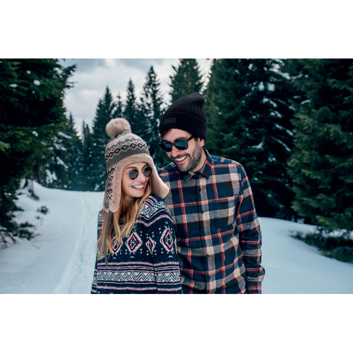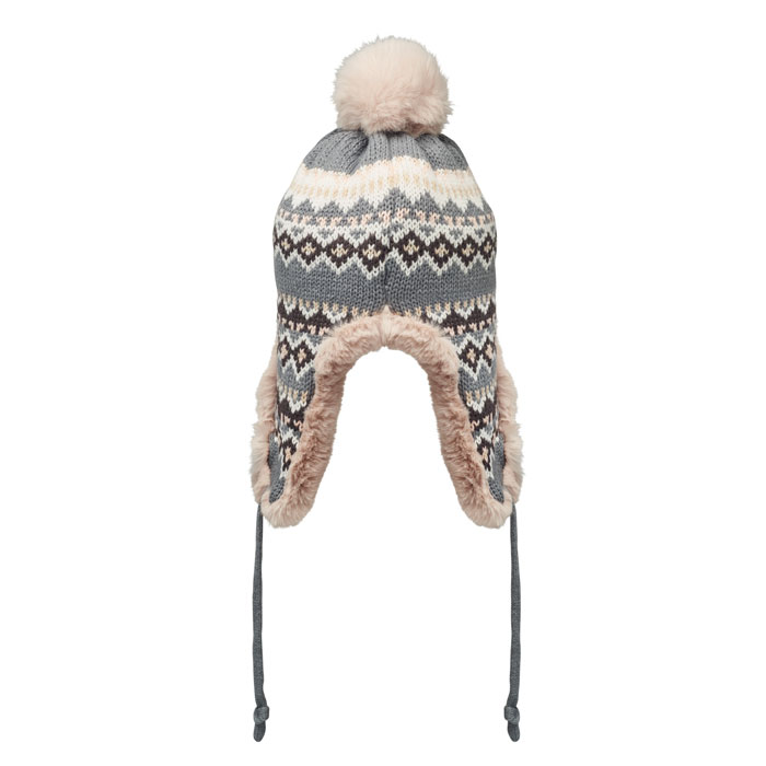 Berretto a maglia con copriorecchie e pom pom in fibra acrilica e foderato in poliestere e pile. Include un'etichetta per la stampa su un lato. Taglia adulto.