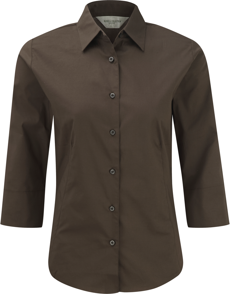 97% cotone popeline / 3% elastan. Morbido tessuto leggermente elasticizzato per offrire il massimo comfort. Colletto classico con un unico bottone. Maniche a 3/4 con spacchetti ai polsini. Bottoni in tinta. Pinces sul busto e sulla schiena per un taglio modellato. Base arrotondata. Bottoni di scorta. Facile da stirare.