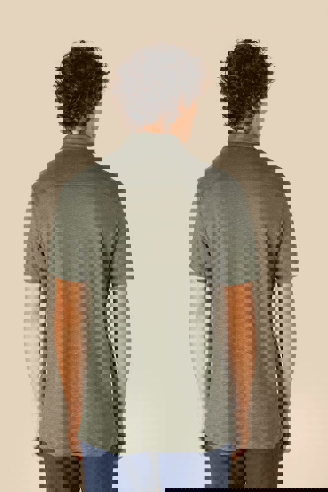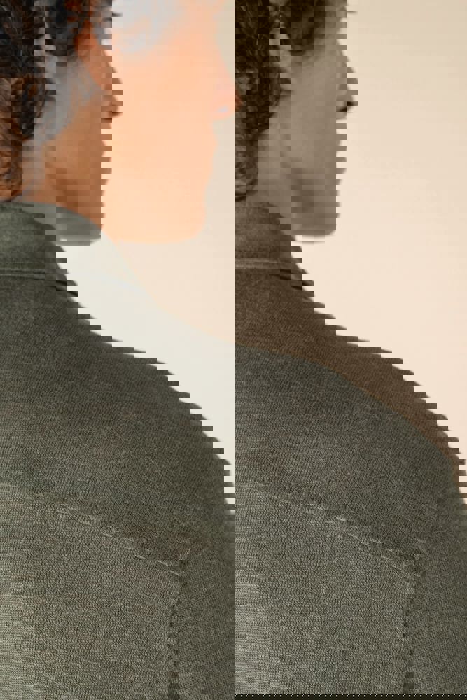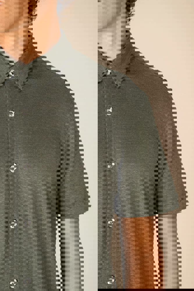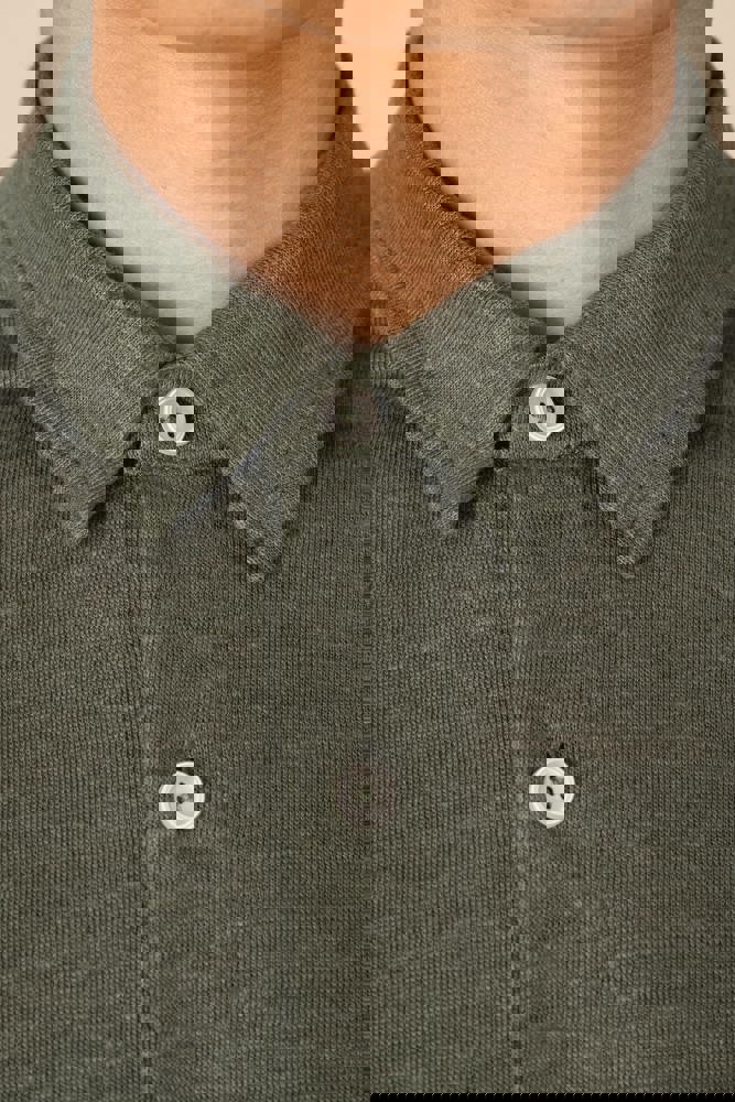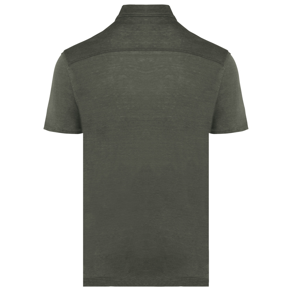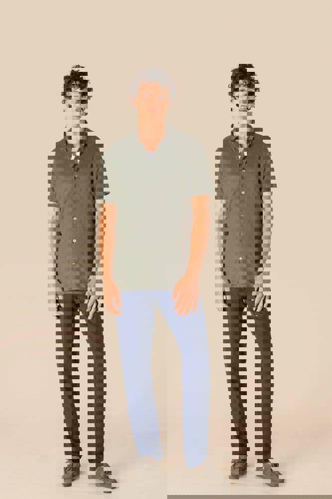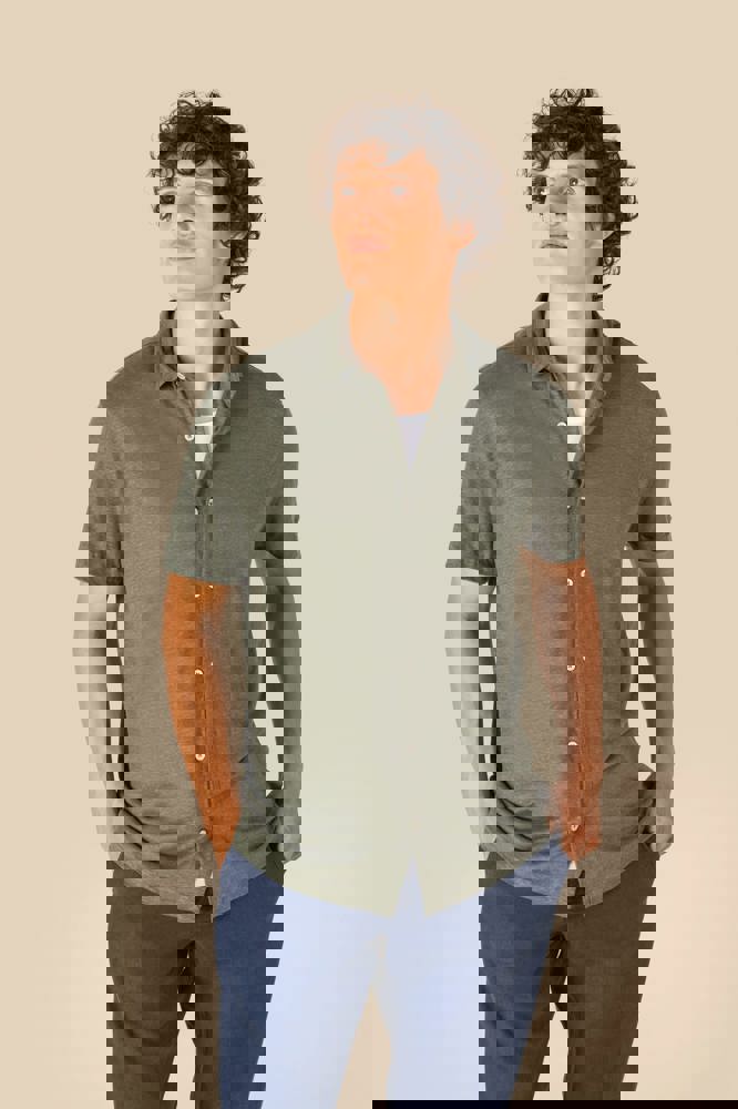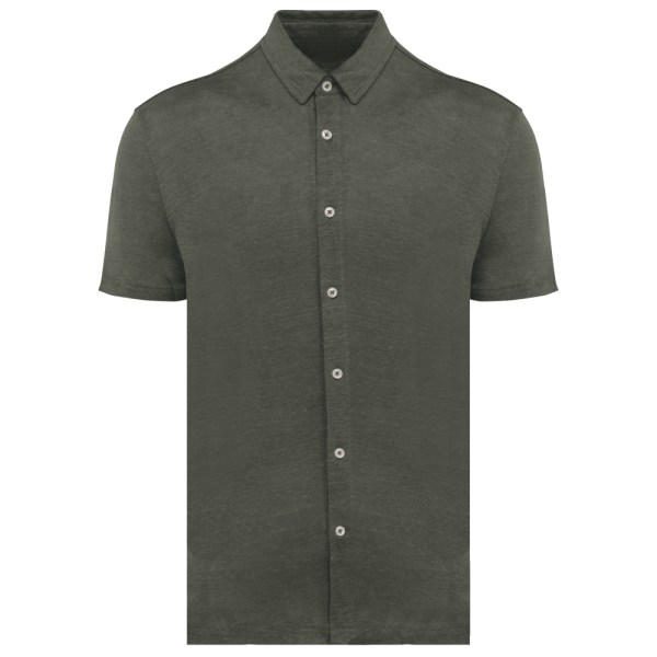 100% lino. Maglia. Taglio dritto. Collo con listino. Inserto sulla schiena. Orlo a impuntura semplice a fondo manica e fondo capo. Pattina con bottoni a contrasto effetto madreperla in plastica riciclata per tutti i colori.