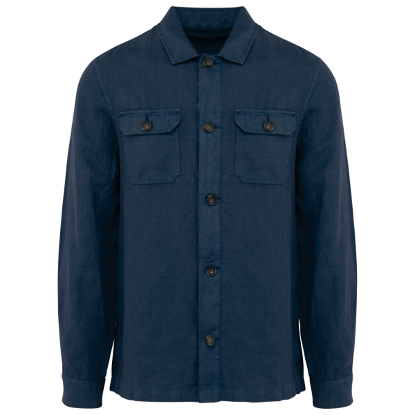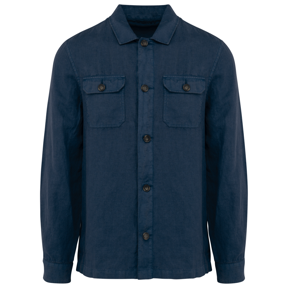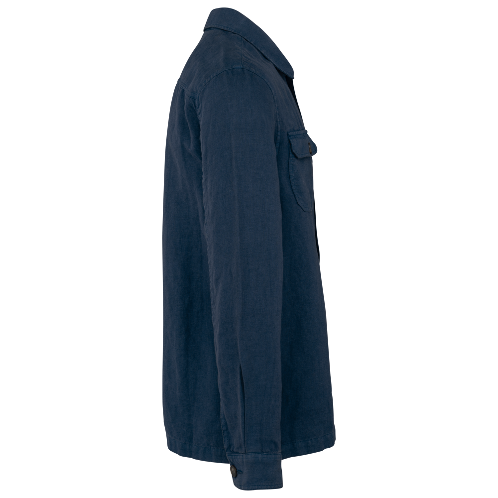 100% lino. Tessuto. Taglio dritto. Aspetto slavato. Pattina con bottoni a contrasto in plastica riciclata effetto corno. Polsino a fondo manica con spacchetto e bottone. Collo con listino fantasia. Due tasche applicate con patta e bottone. Asola interna nel tessuto principale per appendere il capo. Inserto sulla schiena. Doppia impuntura sui fianchi, inserto su schiena e maniche. Orlo a impuntura semplice a fondo capo. Fodera interna a farfalla con patch di personalizzazione nel tessuto principale. Indumento tinto in capo dopo la confezione: i colori possono variare leggermente da un prodotto all'altro. Il prodotto potrebbe stingere a contatto con superfici o capi chiari.