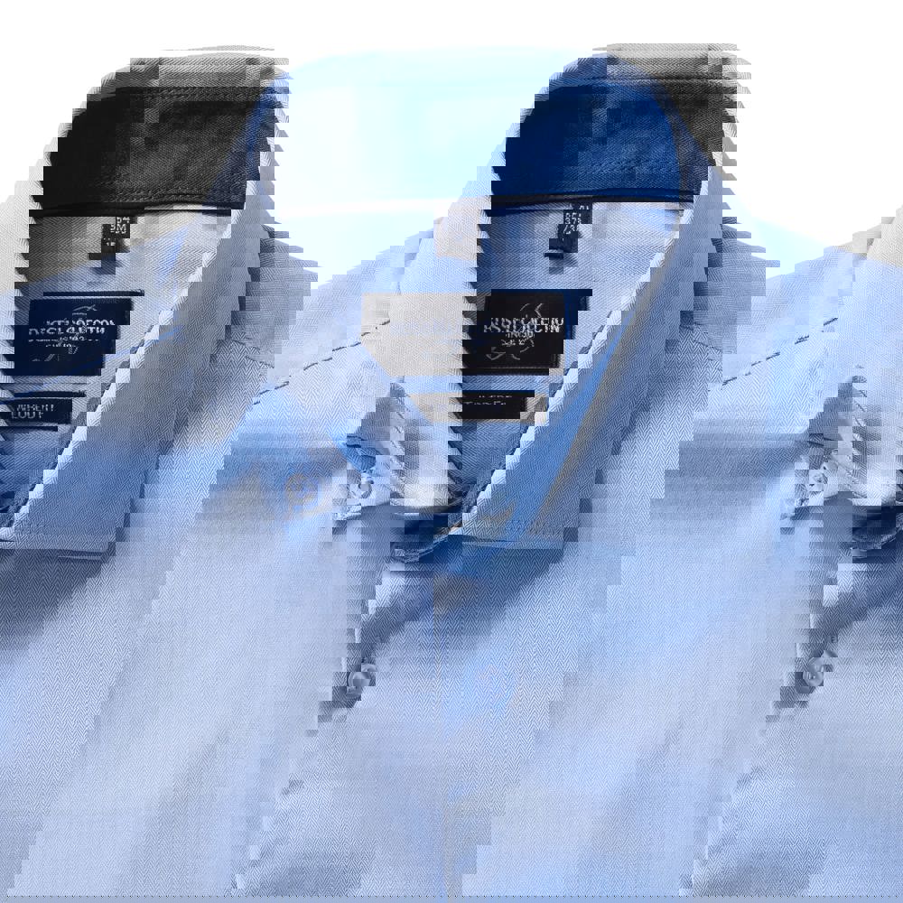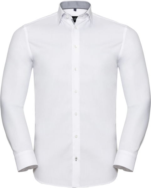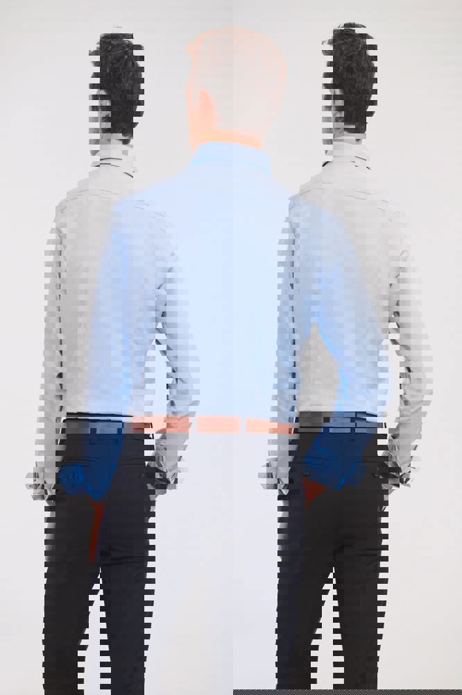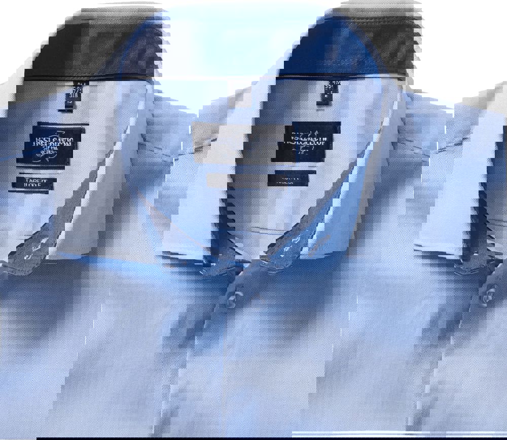 84% Cotone, 16% Poliestere. Taglio sartoriale. Sotto il colletto button down. Contrasti : interno polsini, interno colletto, con bordo in contrasto. Pattina con bordo in contrasto attorno a bottone inferiore. Colori in contrasto in asola dei polsini e occhiello inferiore. Le pince sulla parte posteriore migliorano la vestibilità. Polsini stondati regolabili a 2 bottoni. Orlo stondato.