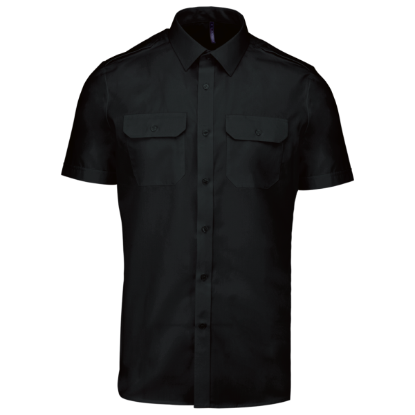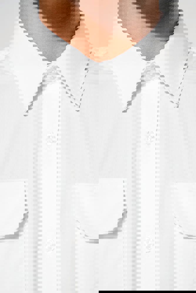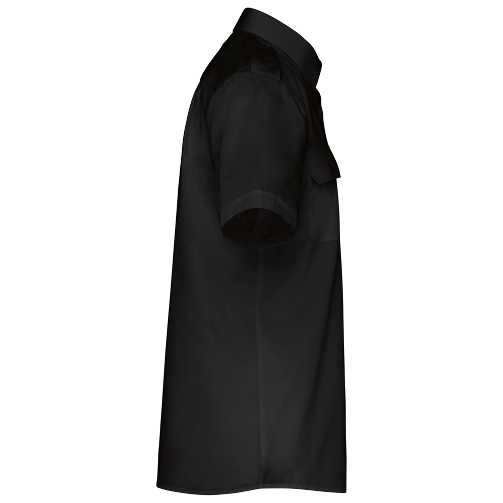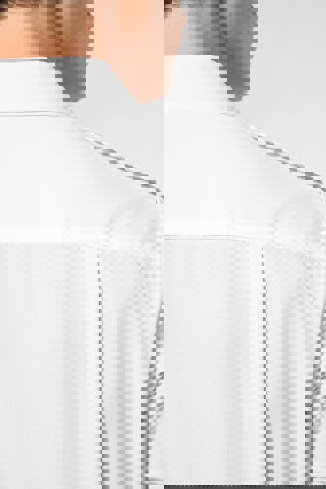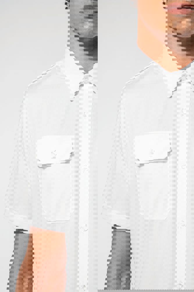65% poliestere / 35% popeline di cotone. Facile da lavare (trattamento Easy Care). Bottoni tono su tono. 2 tasche sul petto con patta, di cui una con porta-penna lato cuore. Piega comfort sul retro. Pattina sulle spalle per applicazione gradi (gradi non inclusi). Finitura a falso risvolto a fondo manica.