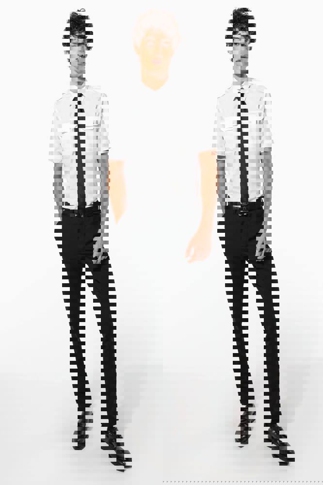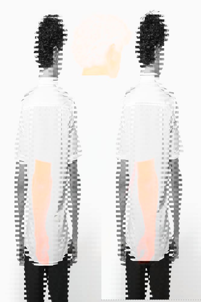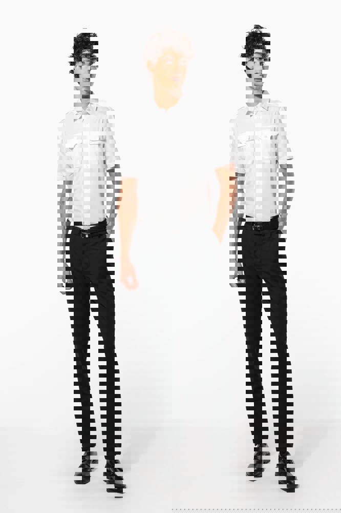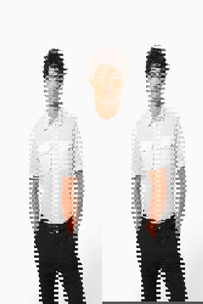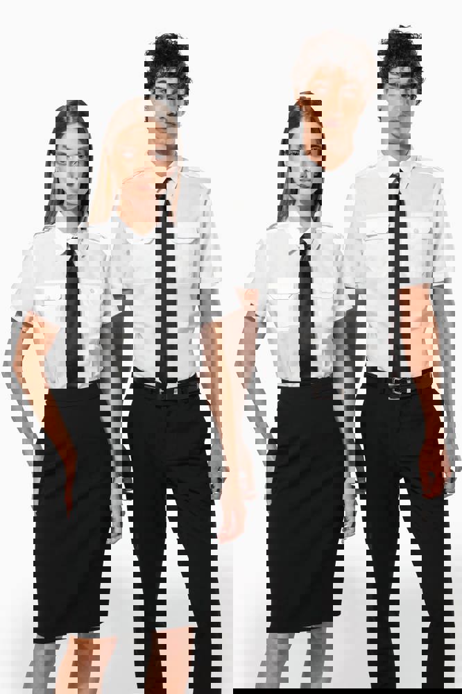 65% poliestere / 35% popeline di cotone. Facile da lavare (trattamento Easy Care). Bottoni tono su tono. 2 tasche sul petto con patta, di cui una con porta-penna lato cuore. Piega comfort sul retro. Pattina sulle spalle per applicazione gradi (gradi non inclusi). Finitura a falso risvolto a fondo manica.