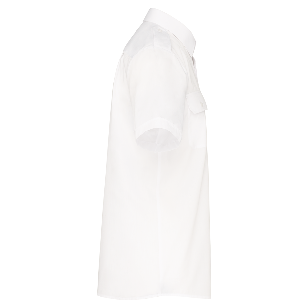 65% poliestere / 35% popeline di cotone. Facile da lavare (trattamento Easy Care). Bottoni tono su tono. 2 tasche sul petto con patta, di cui una con porta-penna lato cuore. Piega comfort sul retro. Pattina sulle spalle per applicazione gradi (gradi non inclusi). Finitura a falso risvolto a fondo manica.