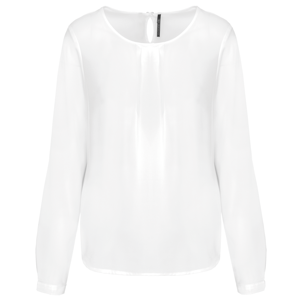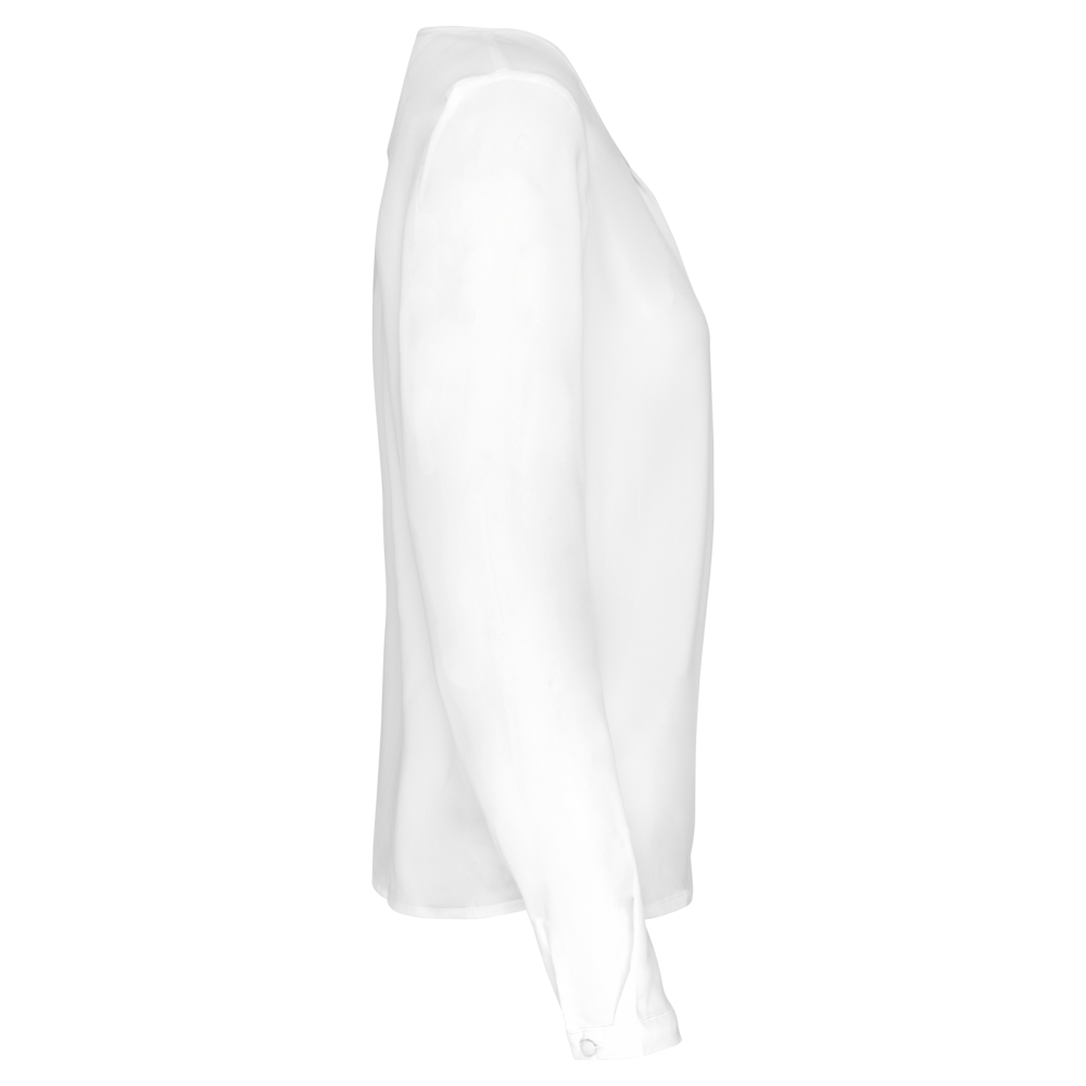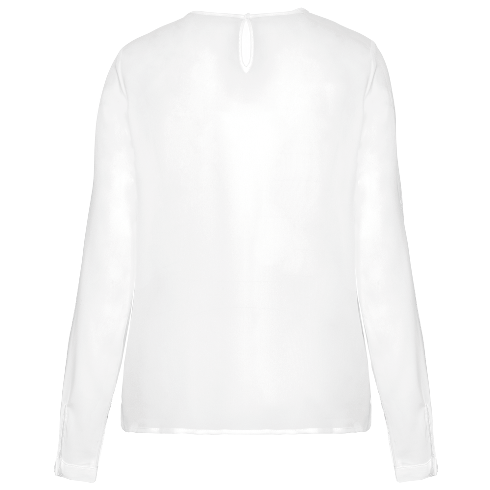 100% poliestere. Tessuto crêpe fluido e leggero. Girocollo rifinito in tralice. Piccole plissettature al collo sul davanti. Chiusura sul retro e sul fondo delle maniche con un bottone coperto.