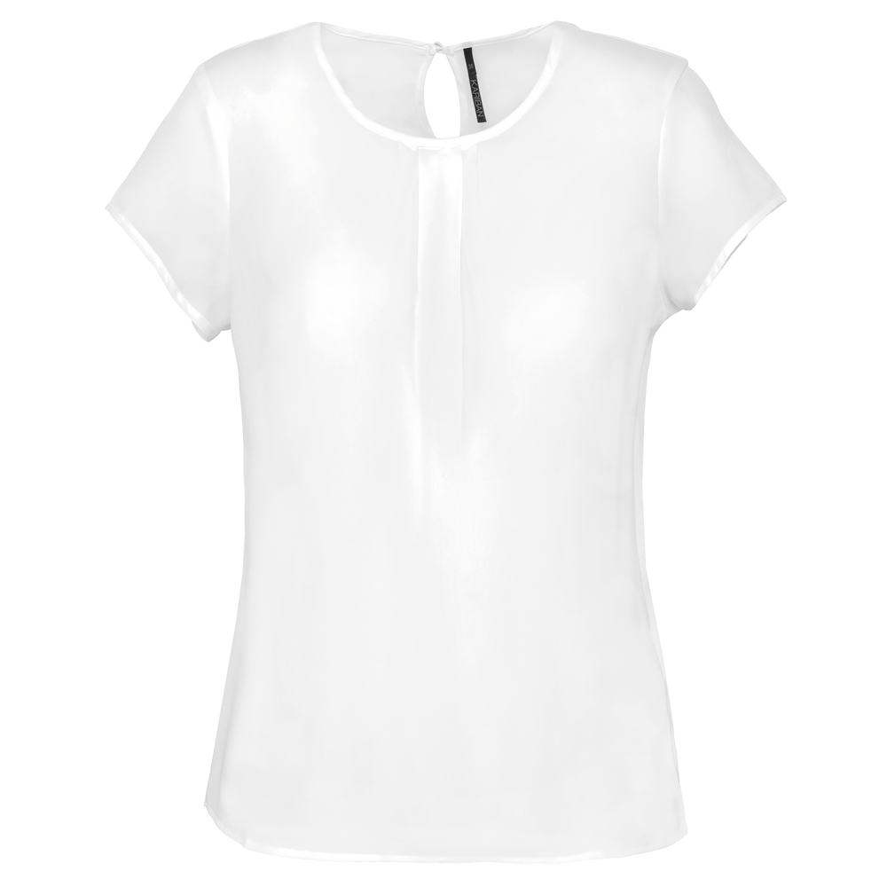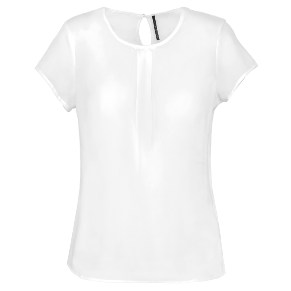 100% poliestere. Tessuto crêpe fluido e leggero. Girocollo. Piccole plissettature al collo sul davanti. Chiusura posteriore con bottone tono su tono.