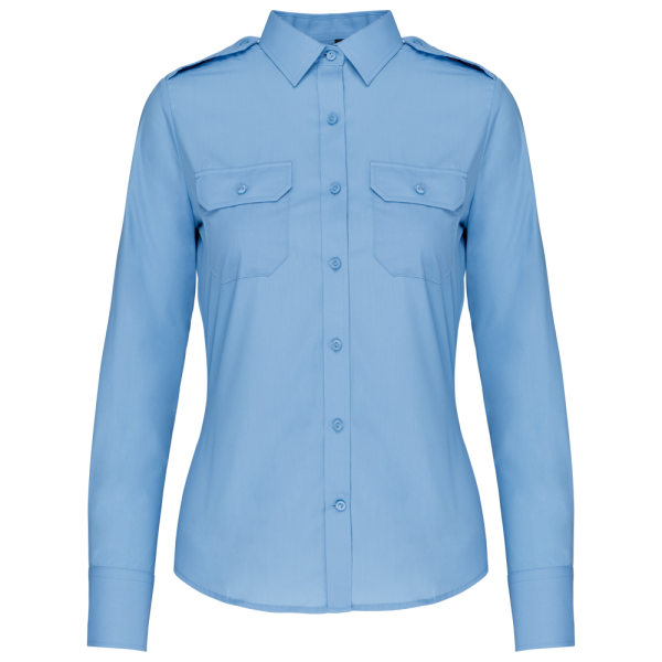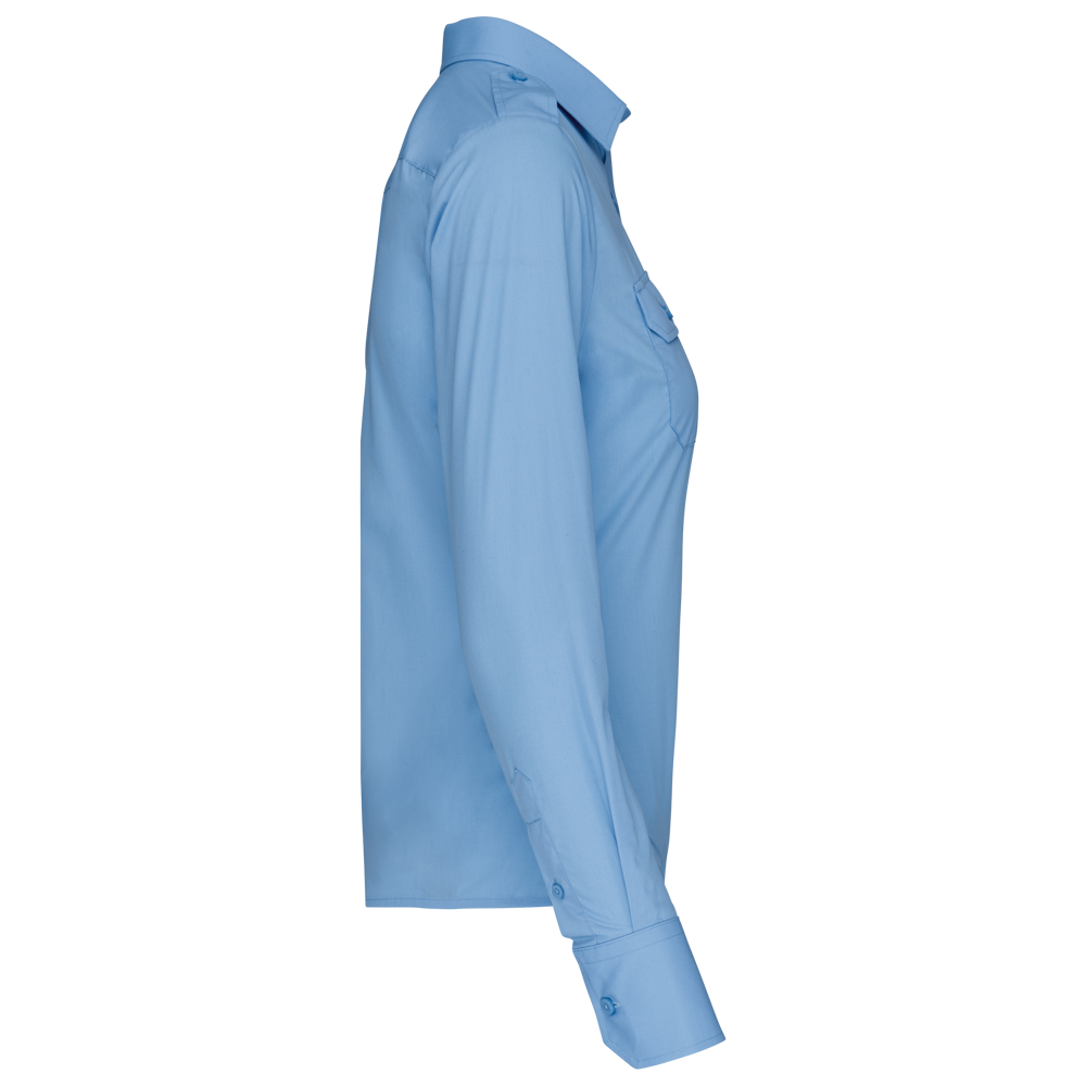 65% poliestere / 35% popeline di cotone. Facile da lavare (trattamento Easy Care). Bottoni tono su tono. 2 tasche sul petto con patta, di cui una con porta-penna lato cuore. Pattina sulle spalle per applicazione gradi (gradi non inclusi). Polsini regolabili con bottoni.