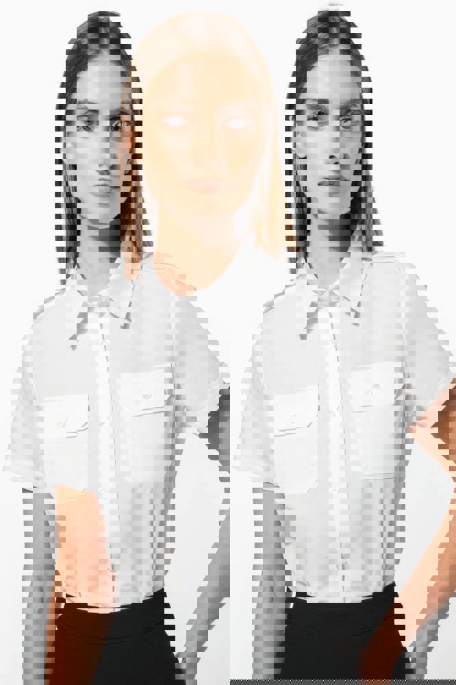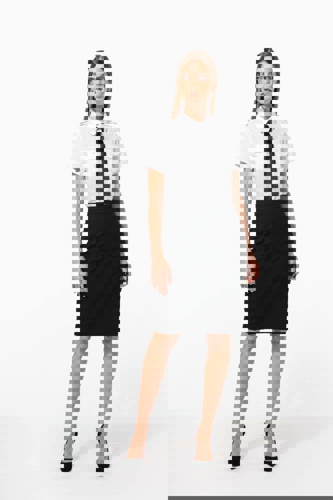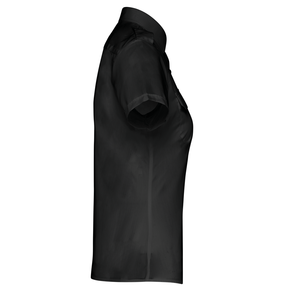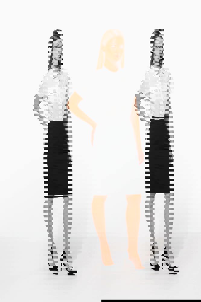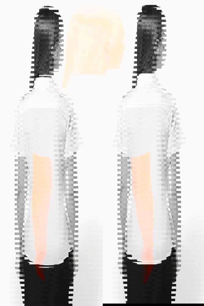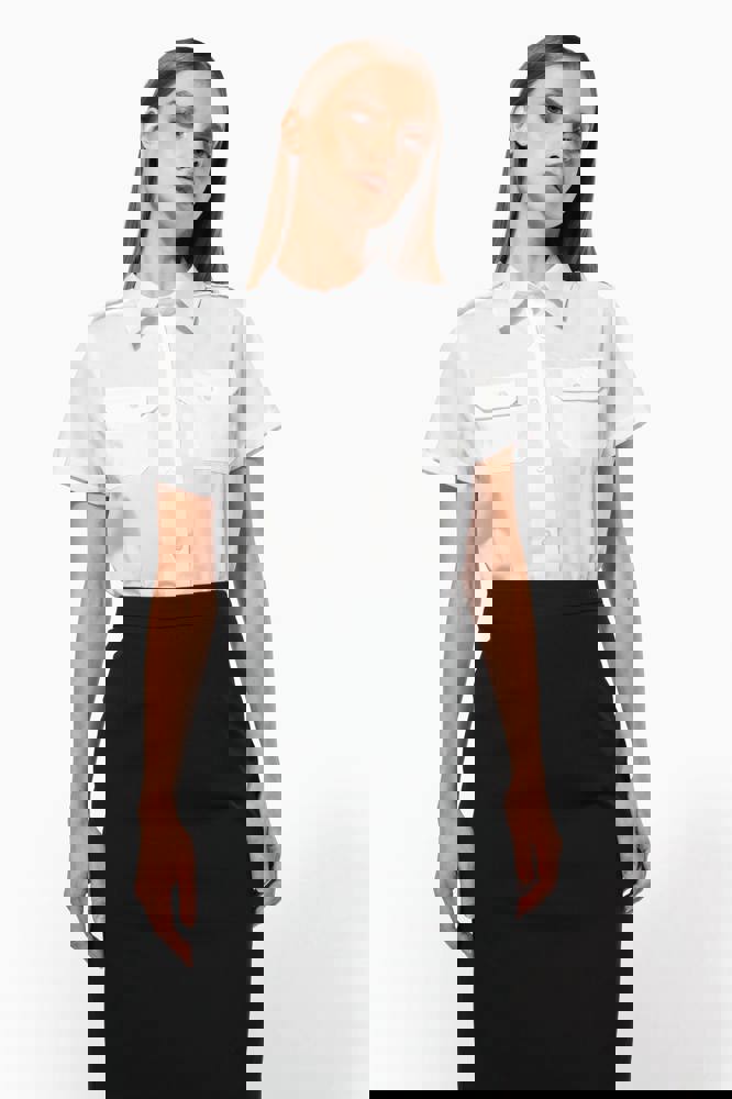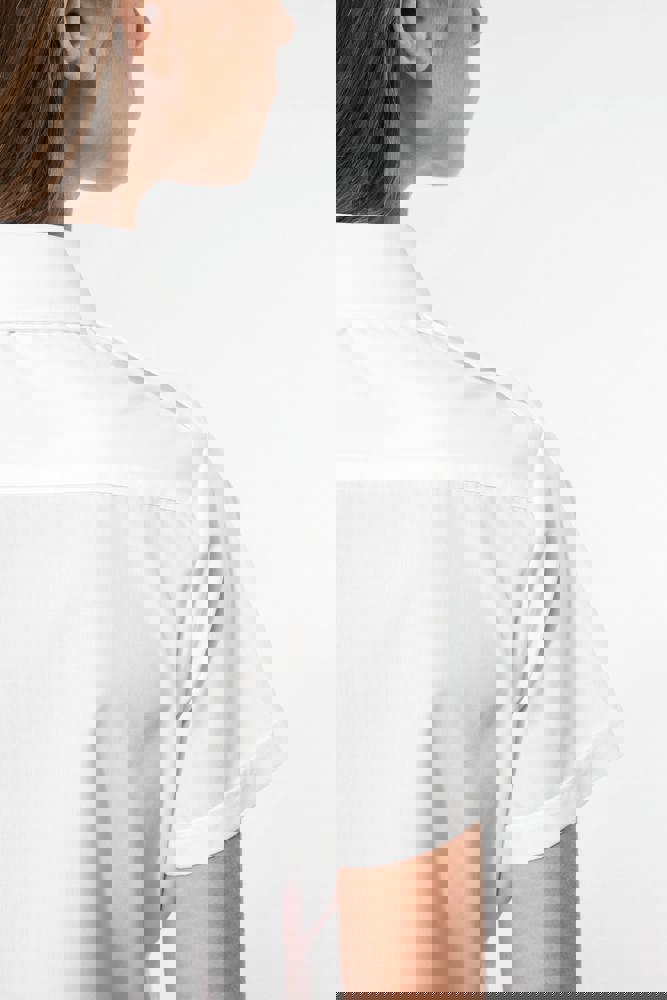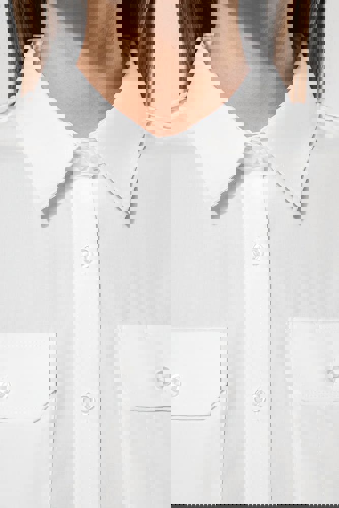 65% poliestere / 35% popeline di cotone. Facile da lavare (trattamento Easy Care). Bottoni tono su tono. 2 tasche sul petto con patta, di cui una con porta-penna lato cuore. Pattina sulle spalle per applicazione gradi (gradi non inclusi). Finitura a falso risvolto a fondo manica.