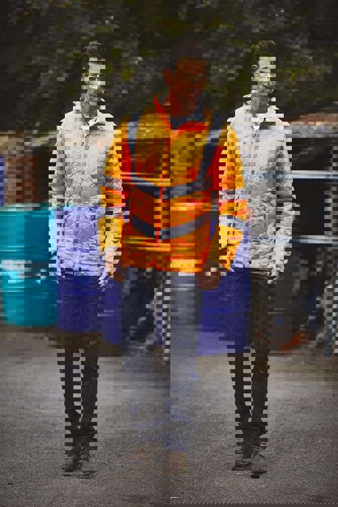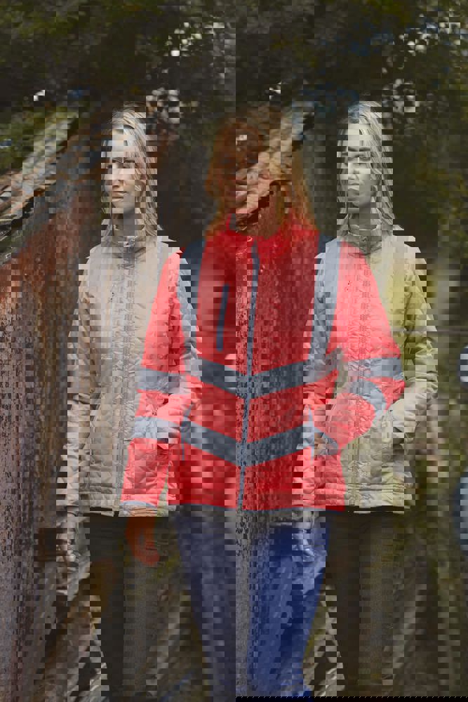 100% poliestere esterno idrorepellente con fodera in pile e imbottitura 100% poliestere. 2 fasce riflettenti (larghezza 5 cm) a forma di V su corpo e braccia per una maggiore visibilità. Collo alto con proteggi mento integrato. Tasca con zip sul petto. 2 tasche laterali scalda-mani con zip. 1 tasca applicata nella fodera fissa in pile. Bordini riflettenti a fondo manica e fondo capo. Zip per personalizzazione invisibile a fondo capo (lato interno). Conforme alla norma EN ISO 20471:2013 Classe 3 (solo i colori Hi-Vis Yellow e Hi-Vis Orange) e alla norma britannica GO/RT 3279 Issue 8:2013 relativa agli "Indumenti ad alta visibilità" nel settore ferroviario (solo Hi-Vis Orange).