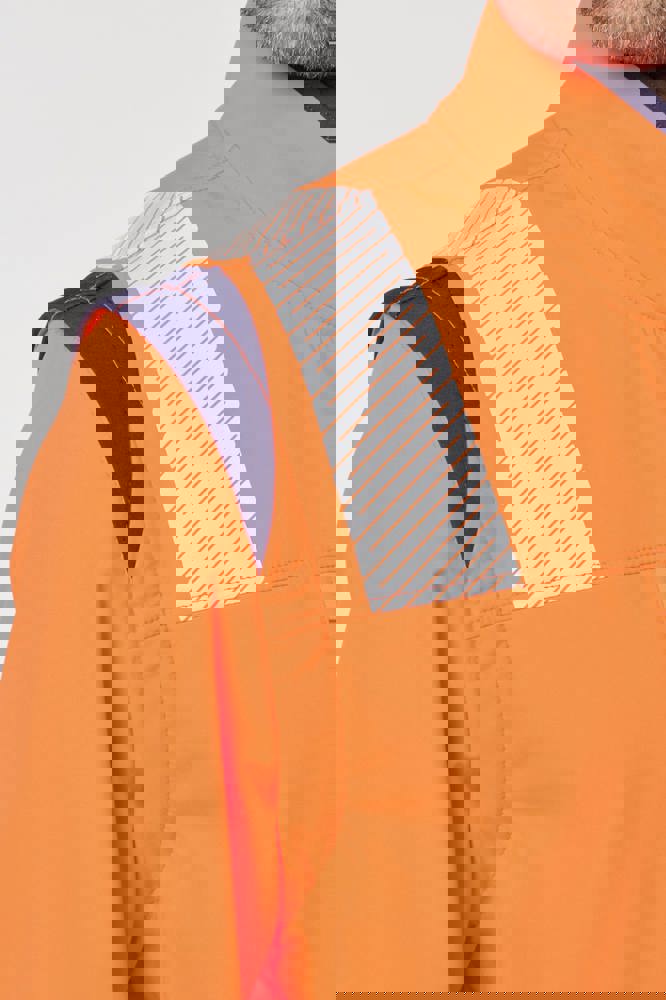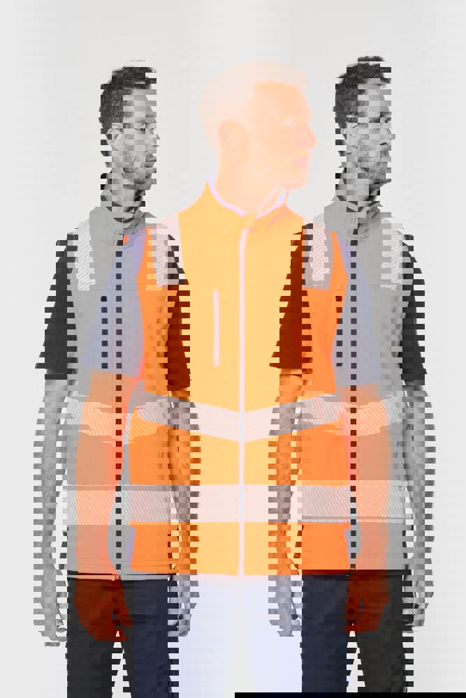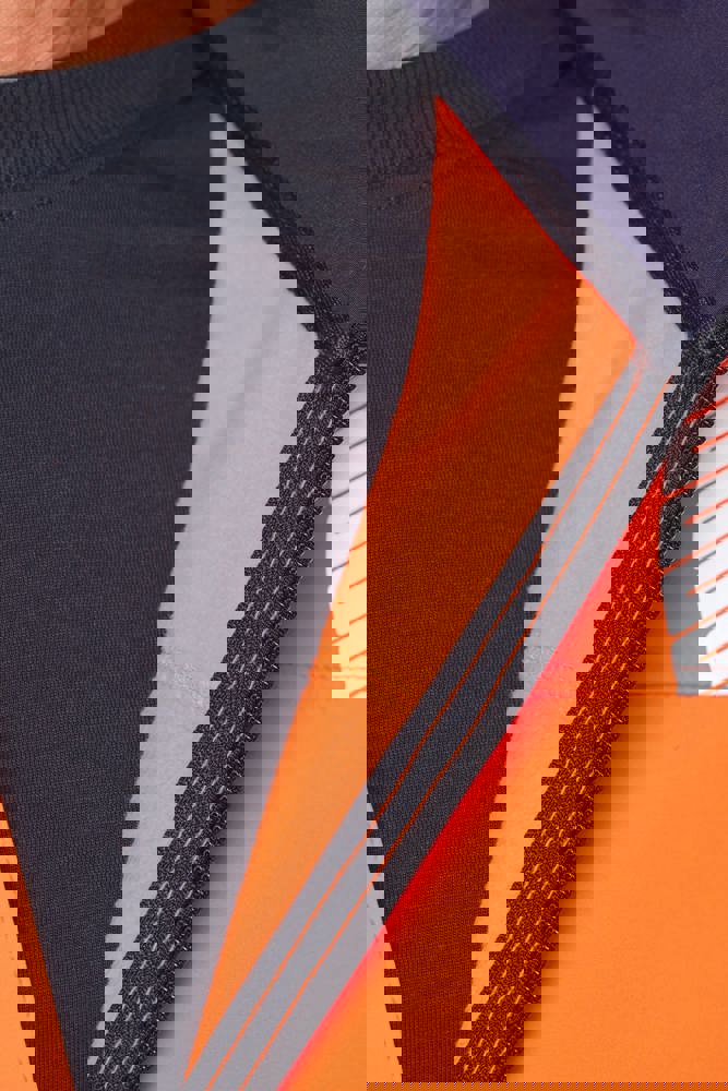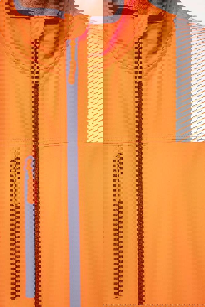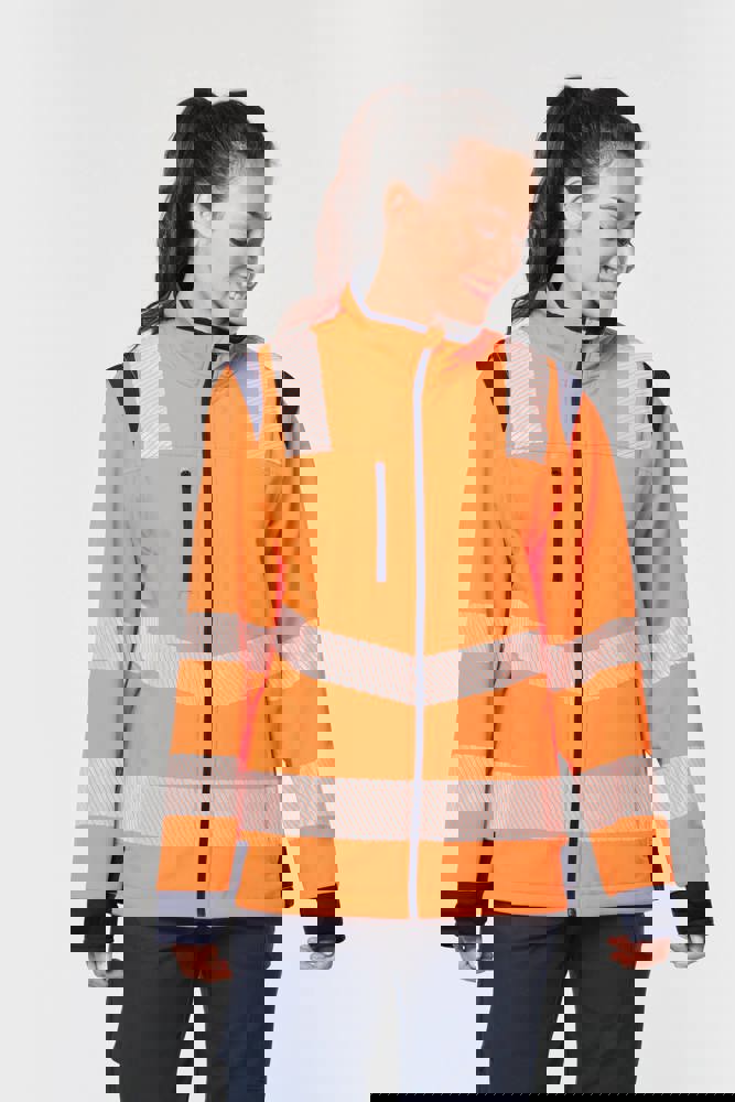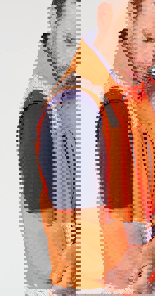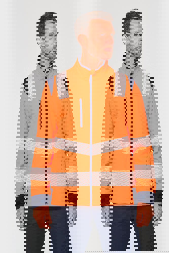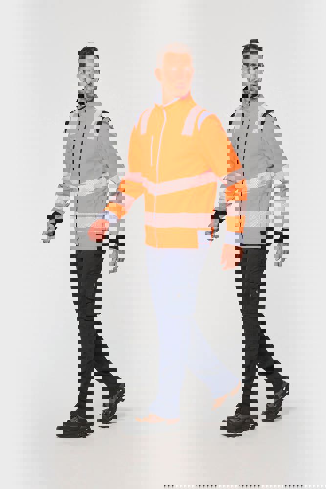 94% poliestere riciclato / 6% elastan. Tessuto accoppiato a 3 strati, traspirante 3.000 g/m²/24 h e impermeabile 5.000 mm. Strato esterno: 94% poliestere riciclato / 6% elastan. Strato intermedio: membrana traspirante e impermeabile. Strato interno: micropile 100% poliestere riciclato. Lavaggio a 40 °C (25 cicli). Zip in nylon con protezione per il mento e il tirazip. 1 tasca sul petto verticale con zip sul lato destro. 2 tasche laterali con zip. 2 tasche interne. Polsini regolabili a strappo. Maniche staccabili con zip. Fondo capo regolabile tramite coulisse. Inserti a contrasto su spalle, polsini e fianchi. Interno collo e nastrino di rinforzo a contrasto. Asola all'interno del collo per appendere il capo. Strisce segmentate riflettenti di 5,5 cm sulle spalle, sotto il petto e sulle maniche. Strisce segmentate riflettenti di 7 cm nella parte bassa del corpo e delle maniche. DPI Classe II. Norme UNI EN ISO 13688:2013 + UNI EN ISO 13688/A1:2021 (Indumenti di protezione - Requisiti generali), UNI EN ISO 20471:2013 + UNI EN ISO 20471/A1:2017: Indumenti con maniche: Classe 2 per le taglie XS e S - Classe 3 dalla taglia M alla 6XL, Indumenti senza maniche: Classe 1 per le taglie XS e S - Classe 2 dalla taglia M alla 6XL (Indumenti ad alta visibilità - Metodi di prova e requisiti), RIS-3279-TOM Edizione 2:2019 solo per il colore Hi Viz Orange/Navy (Standard del settore ferroviario). Etichetta con il nome della marca rimovibile.