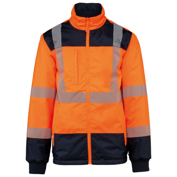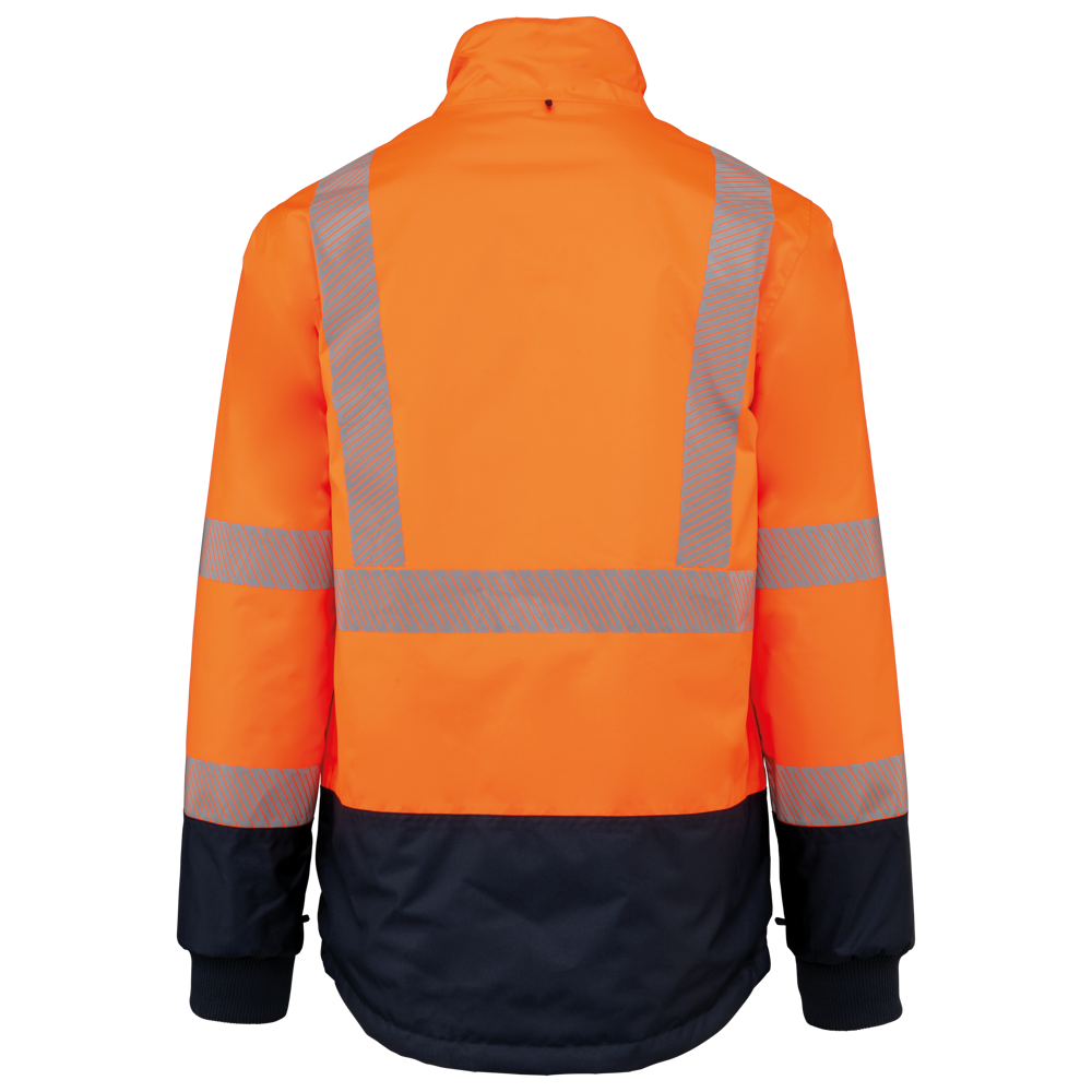 100% poliestere riciclato. Tessuto Oxford con spalmatura in poliuretano. Trattamento impermeabile e cuciture termonastrate. Lavaggio a 40 °C. Zip a doppio cursore con tirazip nascosto sotto una patta con chiusura a strappo. Fodera interna su corpo e maniche in rete 100% poliestere. 2 tasche laterali verticali con zip + 2 tasche orizzontali con pattina con chiusura a strappo. 1 tasca sul petto con zip nascosta sotto la pattina, sul lato sinistro. Polsini regolabili mediante chiusura a strappo. Interno collo a contrasto in pile 100% poliestere con asola per appendere il capo. Cappuccio rimovibile con zip, foderato in rete e regolabile tramite coulisse elasticizzata e strisce a strappo. Tasca per comprimervi il cappuccio nascosta nel collo e dotata di chiusura a strappo. Inserti a contrasto su spalle, fondo manica, fondo capo e pattine delle tasche. Strisce segmentate riflettenti di 5 cm su spalle, petto, corpo e maniche, davanti e dietro. 1 zip sul petto + 1 tasca applicata con chiusura a strappo sul lato interno sinistro. 1 zip interna per la personalizzazione a fondo capo. Fondo capo regolabile tramite coulisse elasticizzata. Giacca interna double face: 100% poliestere riciclato. Tessuto Oxford con spalmatura in poliuretano. Trattamento impermeabile e cuciture termonastrate. Lavaggio a 40 °C (25 cicli). Chiusura a zip con cursore double face e tiretto. 2 tasche laterali verticali con zip. 1 tasca sul petto con zip sul lato destro. Finitura a costine 2x2 a fondo manica. Inserti a contrasto sul davanti nella parte superiore del corpo, a fondo manica e a fondo capo, davanti e dietro. Strisce segmentate riflettenti di 5 cm su corpo e maniche, davanti e dietro. Lato double face: 100% poliammide. Tessuto taffetà con spalmatura in PA e imbottitura. 2 tasche laterali verticali con zip. Asola all'interno del collo per appendere il capo. 1 zip invisibile per la personalizzazione a fondo capo nascosta in una cucitura. I due capi sono uniti tra loro mediante un sistema di zip al centro sul davanti e bottoni che si agganciano nel collo e nelle maniche. DPI Classe II. Norme UNI EN ISO 13688:2013 + UNI EN ISO 13688/A1:2021 (Indumenti di protezione - Requisiti generali), UNI EN ISO 20471:2013 + UNI EN ISO 20471/A1:2017: Parka esterno - Classe 3, Giacca interna - Classe 2 (Indumenti ad alta visibilità - Metodi di prova e requisiti), UNI EN 343:2019: Classe 3: 3 solo per il parka esterno (Indumenti di protezione - Protezione dalla pioggia), RIS-3279-TOM Edizione 2:2019 solo per il colore Hi Viz Orange/Navy (Standard del settore ferroviario). Etichetta con il nome della marca rimovibile.