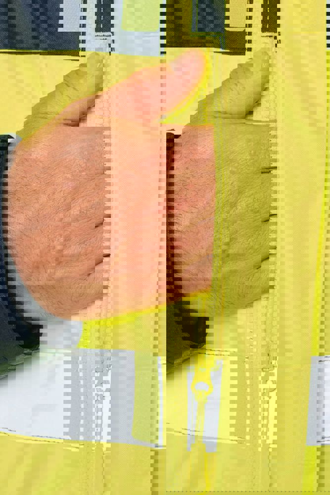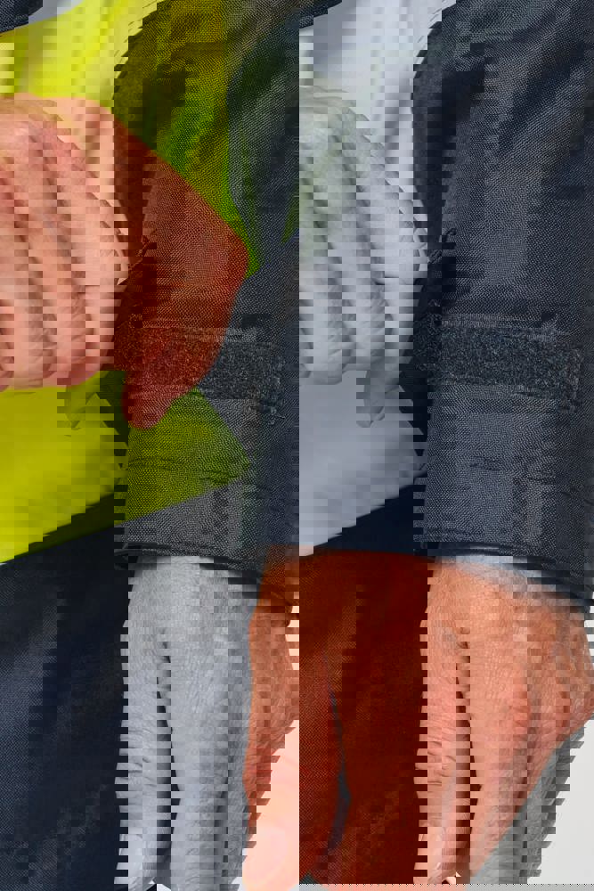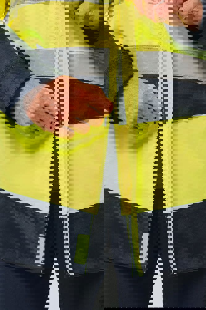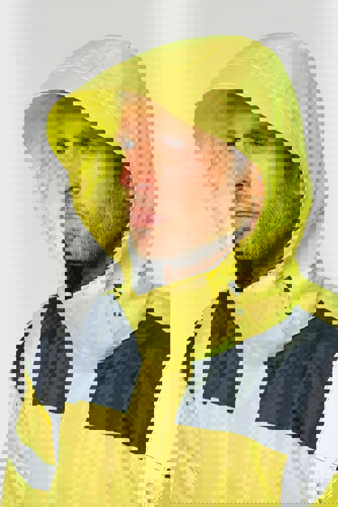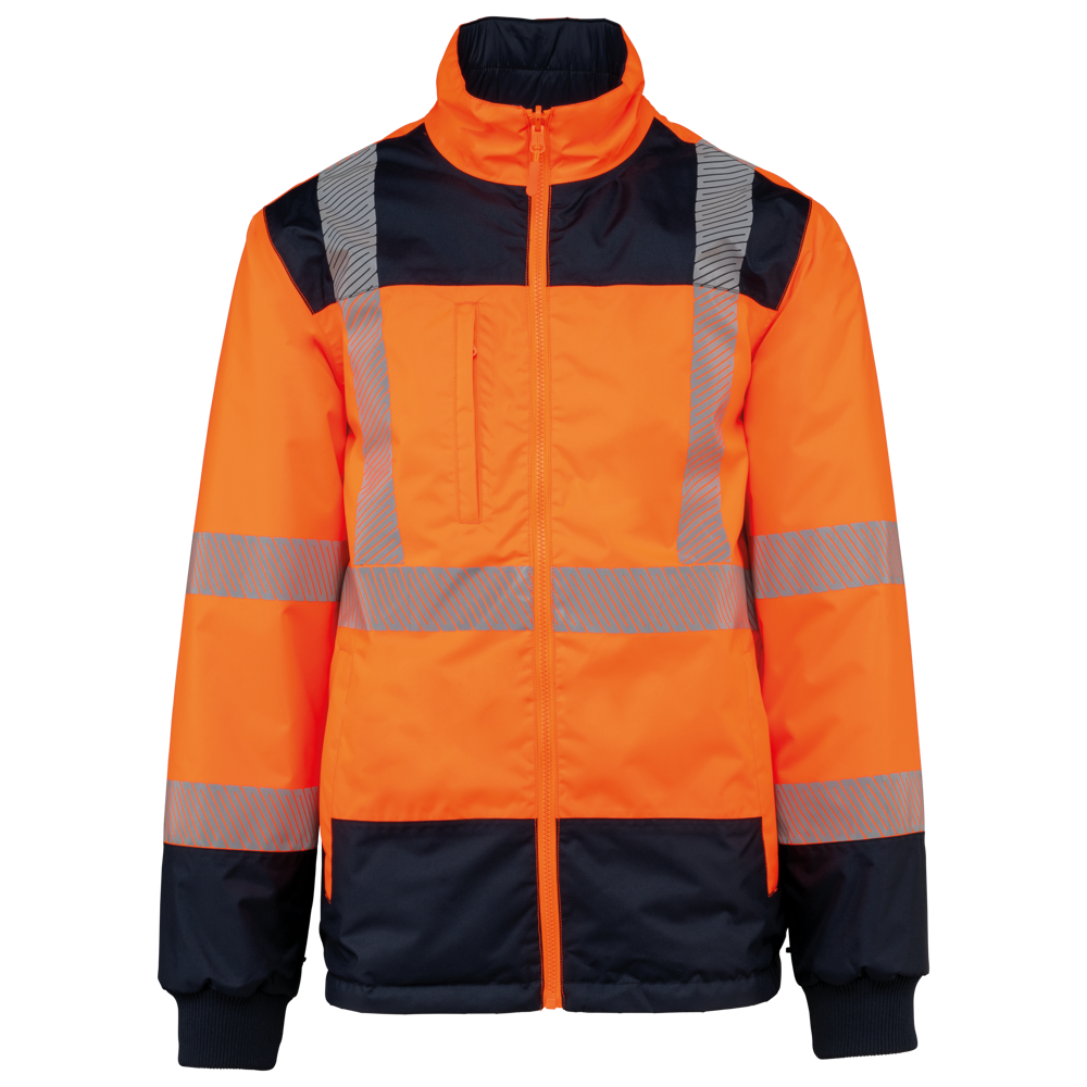 100% poliestere riciclato. Tessuto Oxford con spalmatura in poliuretano. Trattamento impermeabile e cuciture termonastrate. Lavaggio a 40 °C. Zip a doppio cursore con tirazip nascosto sotto una patta con chiusura a strappo. Fodera interna su corpo e maniche in rete 100% poliestere. 2 tasche laterali verticali con zip + 2 tasche orizzontali con pattina con chiusura a strappo. 1 tasca sul petto con zip nascosta sotto la pattina, sul lato sinistro. Polsini regolabili mediante chiusura a strappo. Interno collo a contrasto in pile 100% poliestere con asola per appendere il capo. Cappuccio rimovibile con zip, foderato in rete e regolabile tramite coulisse elasticizzata e strisce a strappo. Tasca per comprimervi il cappuccio nascosta nel collo e dotata di chiusura a strappo. Inserti a contrasto su spalle, fondo manica, fondo capo e pattine delle tasche. Strisce segmentate riflettenti di 5 cm su spalle, petto, corpo e maniche, davanti e dietro. 1 zip sul petto + 1 tasca applicata con chiusura a strappo sul lato interno sinistro. 1 zip interna per la personalizzazione a fondo capo. Fondo capo regolabile tramite coulisse elasticizzata. Giacca interna double face: 100% poliestere riciclato. Tessuto Oxford con spalmatura in poliuretano. Trattamento impermeabile e cuciture termonastrate. Lavaggio a 40 °C (25 cicli). Chiusura a zip con cursore double face e tiretto. 2 tasche laterali verticali con zip. 1 tasca sul petto con zip sul lato destro. Finitura a costine 2x2 a fondo manica. Inserti a contrasto sul davanti nella parte superiore del corpo, a fondo manica e a fondo capo, davanti e dietro. Strisce segmentate riflettenti di 5 cm su corpo e maniche, davanti e dietro. Lato double face: 100% poliammide. Tessuto taffetà con spalmatura in PA e imbottitura. 2 tasche laterali verticali con zip. Asola all'interno del collo per appendere il capo. 1 zip invisibile per la personalizzazione a fondo capo nascosta in una cucitura. I due capi sono uniti tra loro mediante un sistema di zip al centro sul davanti e bottoni che si agganciano nel collo e nelle maniche. DPI Classe II. Norme UNI EN ISO 13688:2013 + UNI EN ISO 13688/A1:2021 (Indumenti di protezione - Requisiti generali), UNI EN ISO 20471:2013 + UNI EN ISO 20471/A1:2017: Parka esterno - Classe 3, Giacca interna - Classe 2 (Indumenti ad alta visibilità - Metodi di prova e requisiti), UNI EN 343:2019: Classe 3: 3 solo per il parka esterno (Indumenti di protezione - Protezione dalla pioggia), RIS-3279-TOM Edizione 2:2019 solo per il colore Hi Viz Orange/Navy (Standard del settore ferroviario). Etichetta con il nome della marca rimovibile.