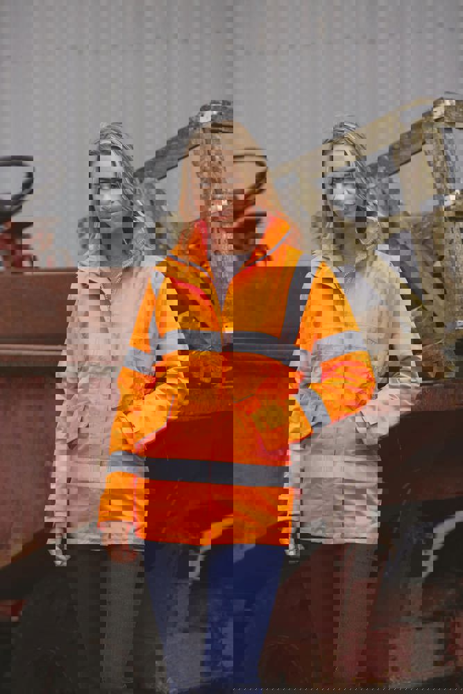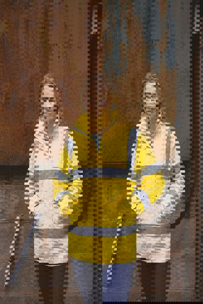 Giacca 100% poliestere con proprietà anti-vento, impermeabile e traspirante. Fodera tono su tono in maglia a rete. Cuciture impermeabili termo-saldate. Cappuccio integrato nel collo con chiusura a strappo. Zip con doppio cursore ultra resistente protetta da patta con chiusura a strappo. Tasche laterali con patta a strappo e dettaglio riflettente. Patta a strappo sui polsini con interno in felpa. Tasca interna sul petto per cellulare sul lato destro. Taglio sagomato e vita semi-elasticizzata per un look più elegante. Zip per personalizzazione invisibile a fondo capo (lato interno). Conforme alle norme EN ISO 20471 Classe 3 e EN 343:2003 + A1:2007 Classe 3.3.