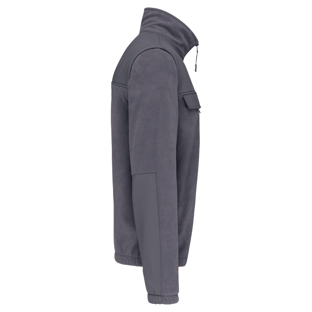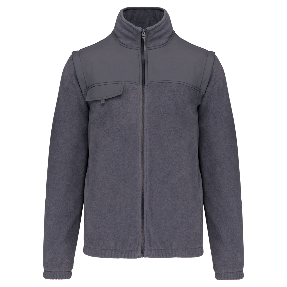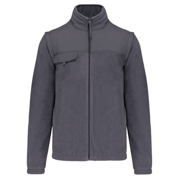 100% poliestere. Esterno: pile 100% poliestere 400 g/m². Rinforzi 100% poliestere Taslon con spalmatura acrilica. Fodera interno maniche poliestere 210T. Giacca in pile 2 in 1. 2 tasche con zip e 1 tasca sul petto con patta e velcro. Protezioni tono su tono davanti, dietro e su avambracci. Personalizzazione facilitata su lato anteriore e schiena. Maniche staccabili foderate in poliestere per maggiore comfort. Polsini e fondo capo elastici.