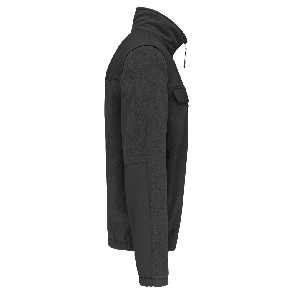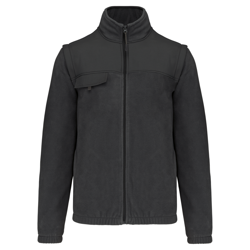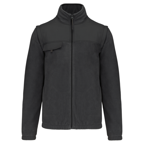 100% poliestere. Esterno: pile 100% poliestere 400 g/m². Rinforzi 100% poliestere Taslon con spalmatura acrilica. Fodera interno maniche poliestere 210T. Giacca in pile 2 in 1. 2 tasche con zip e 1 tasca sul petto con patta e velcro. Protezioni tono su tono davanti, dietro e su avambracci. Personalizzazione facilitata su lato anteriore e schiena. Maniche staccabili foderate in poliestere per maggiore comfort. Polsini e fondo capo elastici.