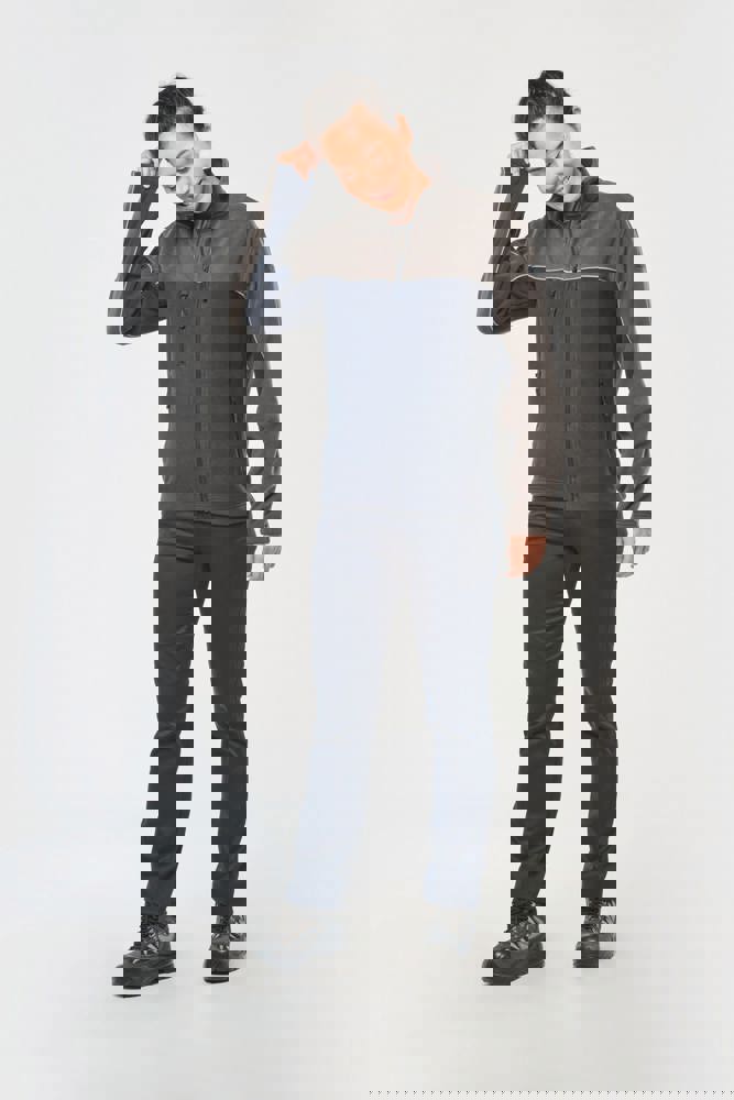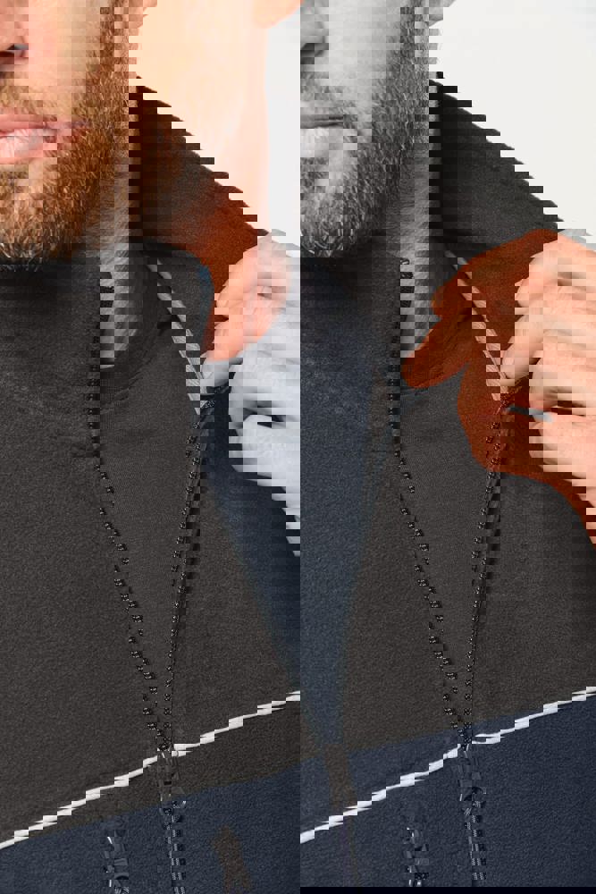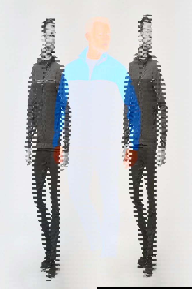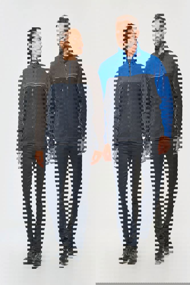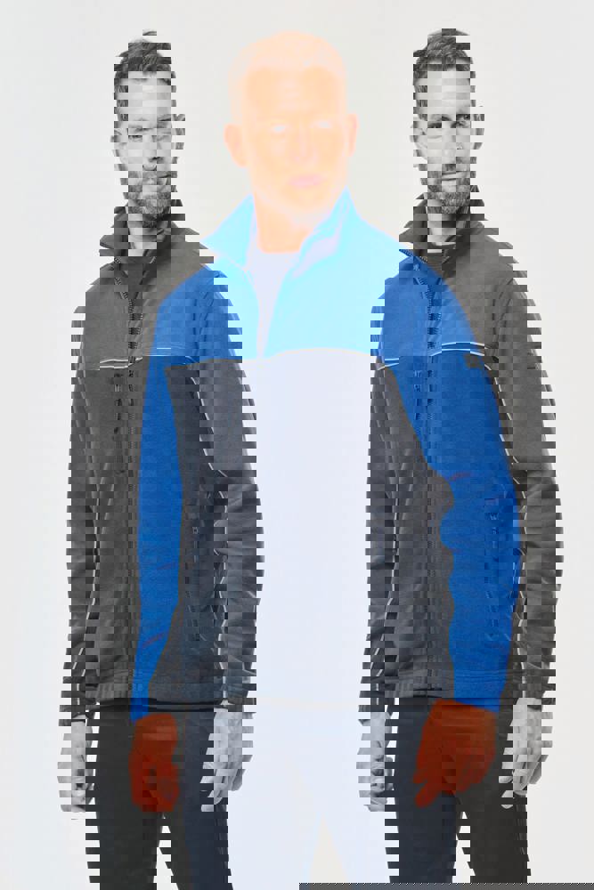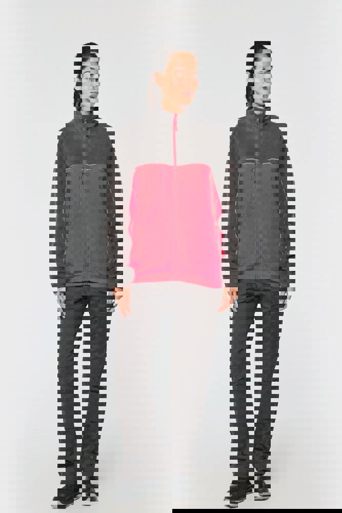 100% poliestere riciclato. Micropile antipilling. Taglio dritto. 2 tasche laterali con zip + 1 tasca sul petto con zip. Chiusura con zip in plastica riciclata tono su tono con cursore. Nastrino di rinforzo a contrasto con motivo spigato. Dettaglio a contrasto tra le parti bicolore del capo (corpo e maniche davanti e dietro). Porta penna elasticizzato a 3 scomparti sulla manica sinistra. Asola all'interno del collo per appendere il capo. Fondo manica e fondo capo elasticizzati. Etichetta con il nome marchio staccabile.
