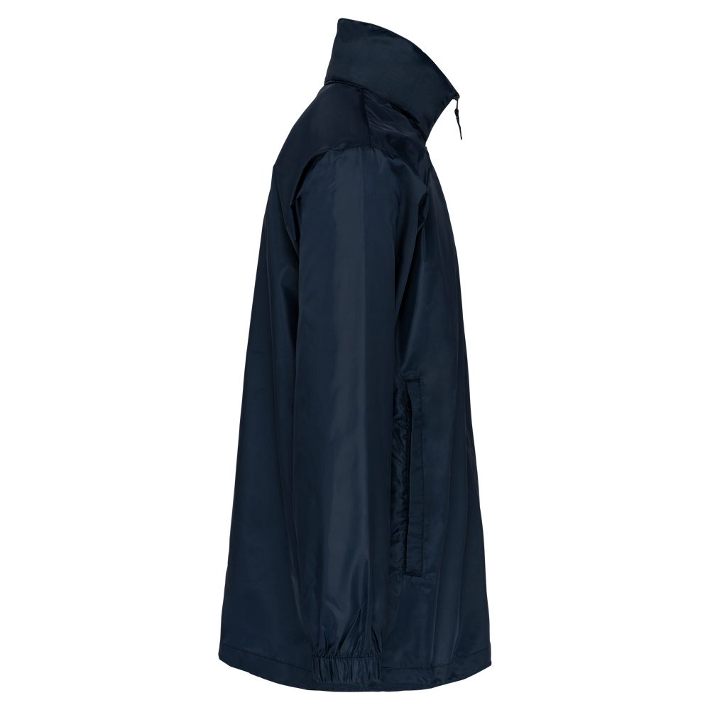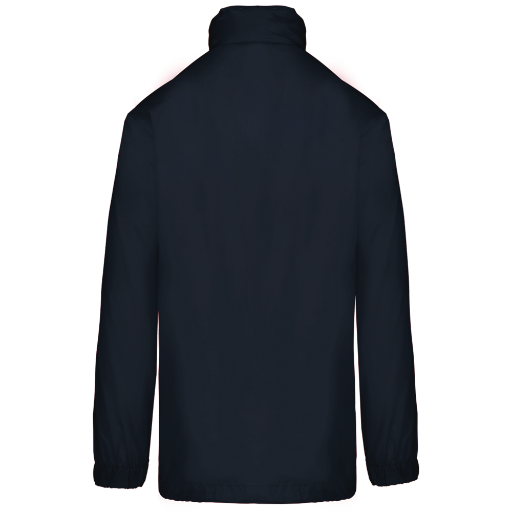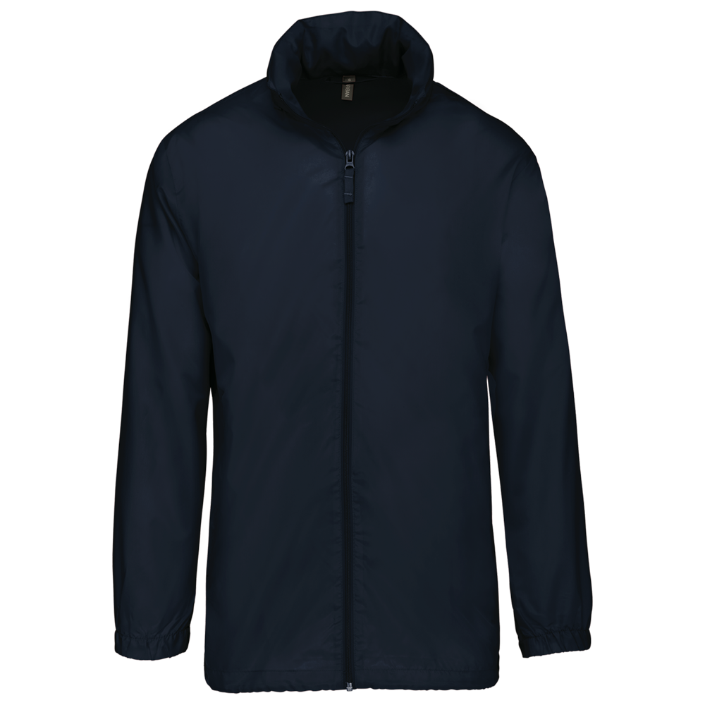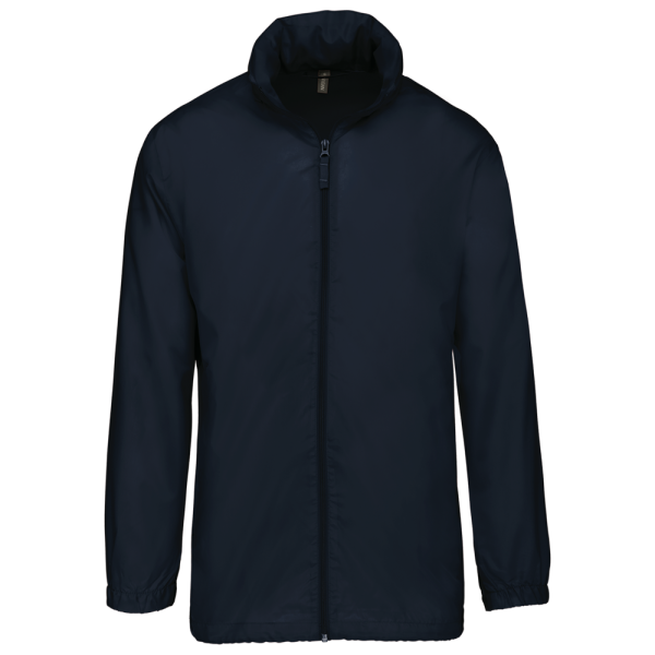 100% poliestere. Cappuccio a scomparsa con chiusura a strappo. 2 tasche anteriori con zip. Coulisse al girovita. Polsini elasticizzati. Piegatura sistema K-way®. Full zip anteriore.