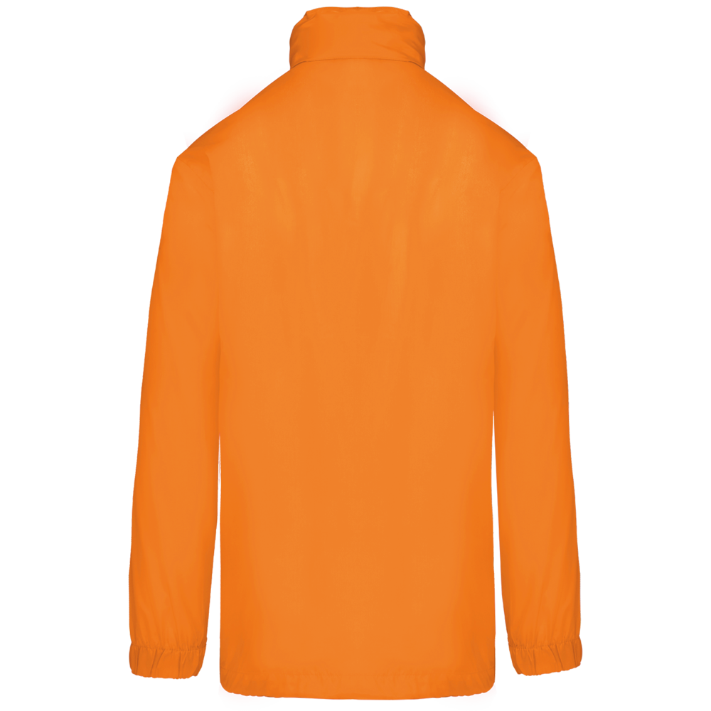 100% poliestere. Cappuccio a scomparsa con chiusura a strappo. 2 tasche anteriori con zip. Coulisse al girovita. Polsini elasticizzati. Piegatura sistema K-way®. Full zip anteriore.