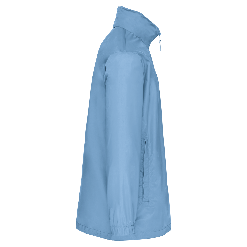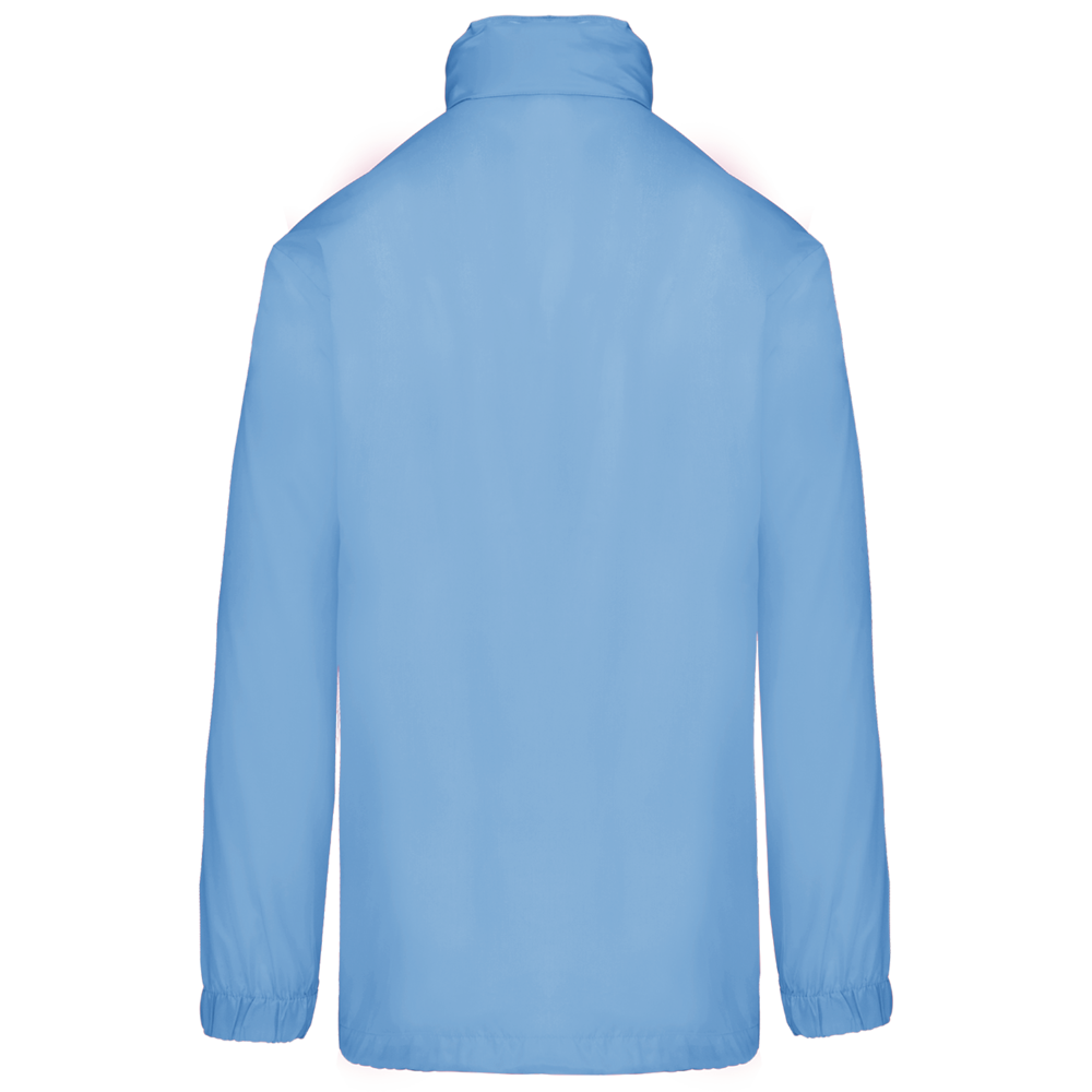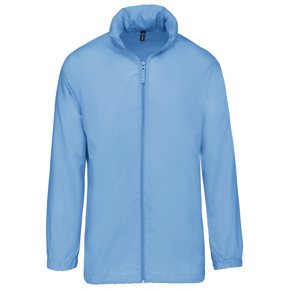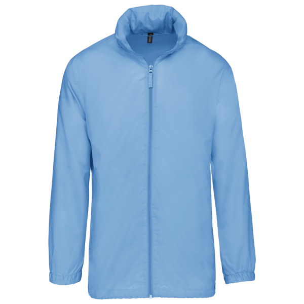 100% poliestere. Cappuccio a scomparsa con chiusura a strappo. 2 tasche anteriori con zip. Coulisse al girovita. Polsini elasticizzati. Piegatura sistema K-way®. Full zip anteriore.