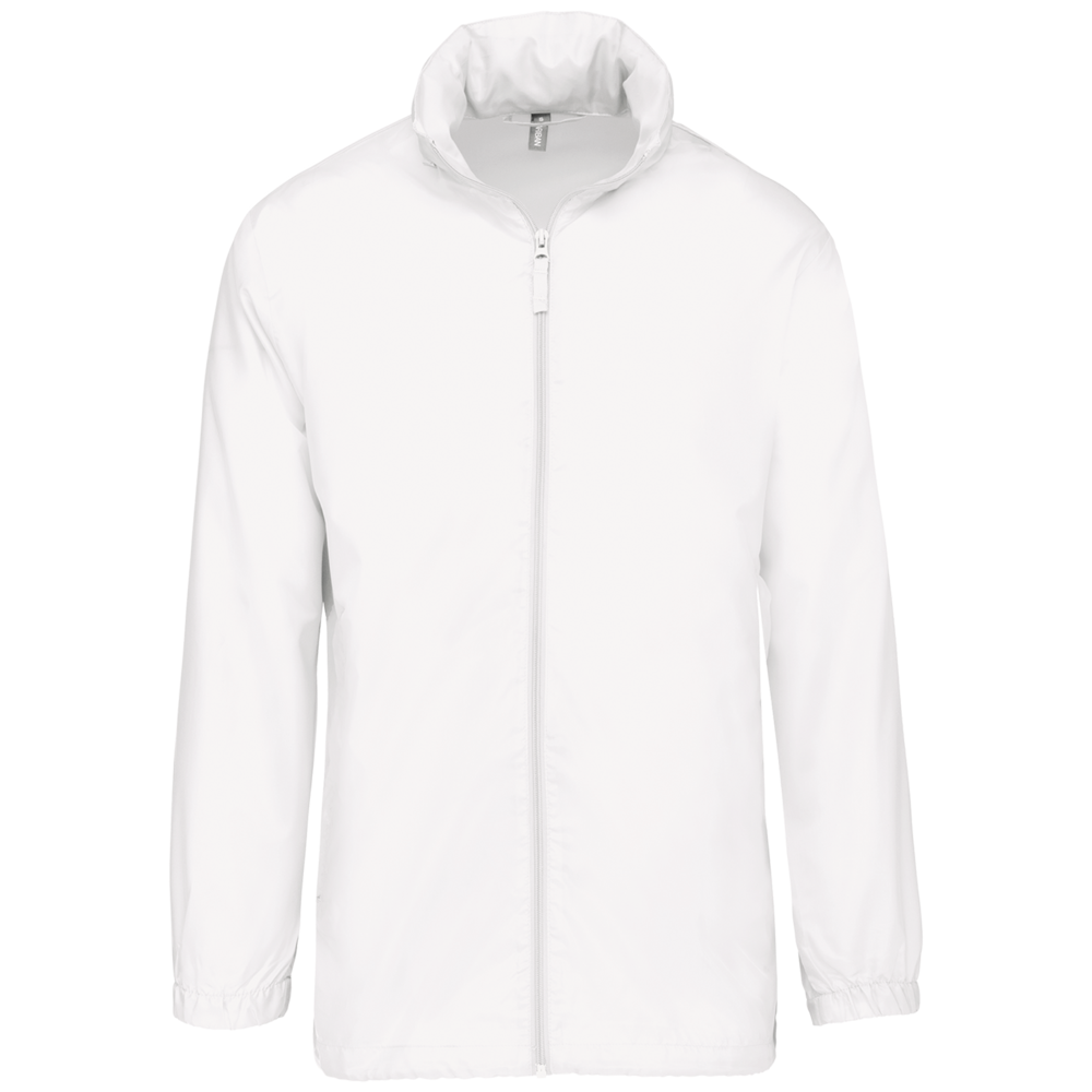 100% poliestere. Cappuccio a scomparsa con chiusura a strappo. 2 tasche anteriori con zip. Coulisse al girovita. Polsini elasticizzati. Piegatura sistema K-way®. Full zip anteriore.