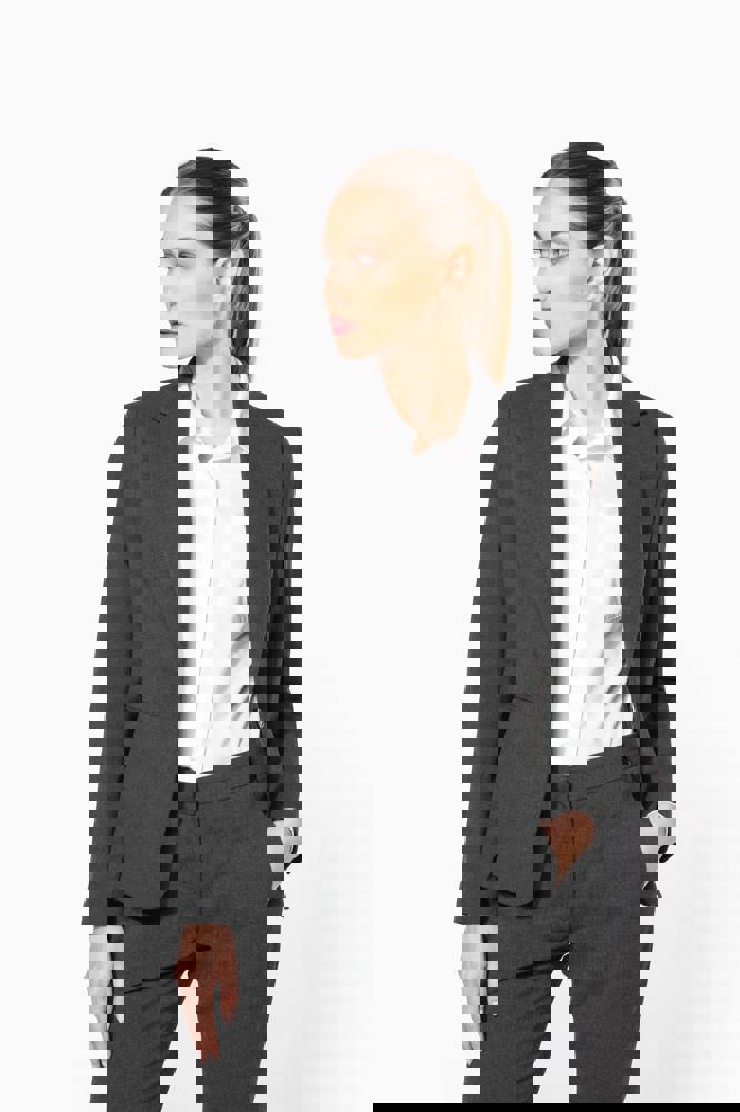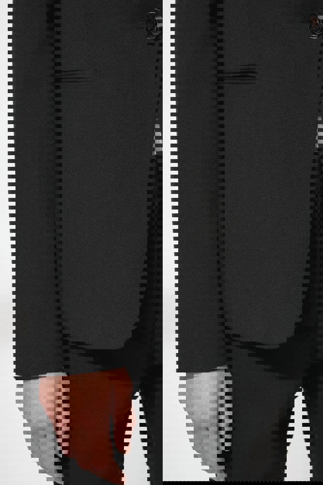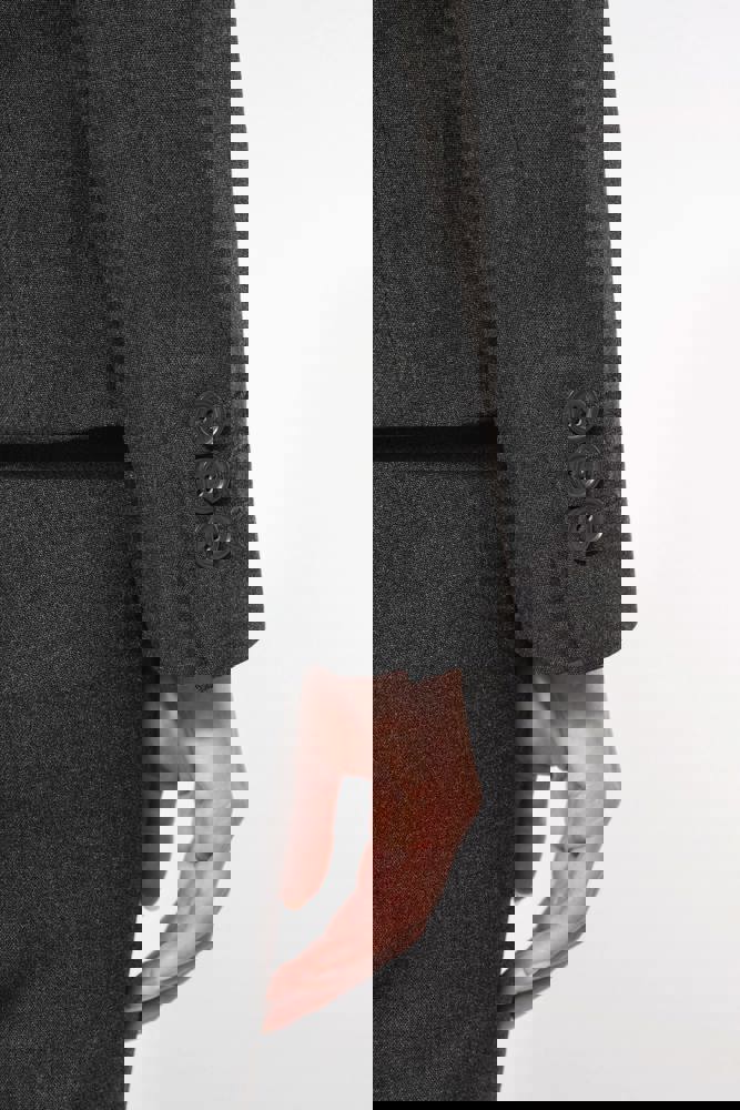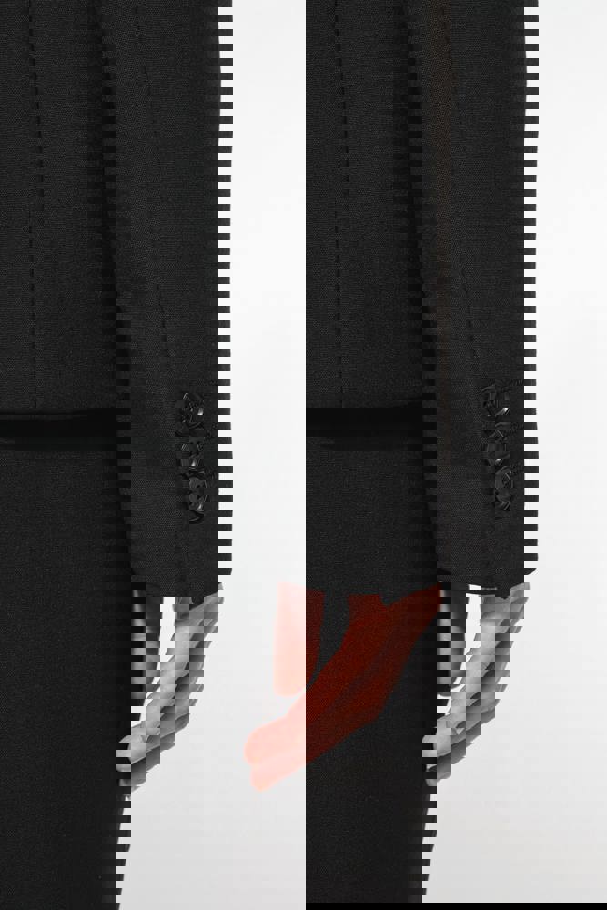 64% poliestere / 34% viscosa / 2% elastan. Fodera 100% poliestere taffetà. Giacca con 1 bottone. 2 tasche a filetto sul davanti. 2 tasche interne con bottone. Fondo manica con 3 bottoni. 1 spacchetto comfort sul retro.