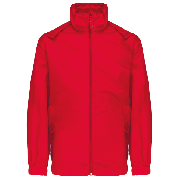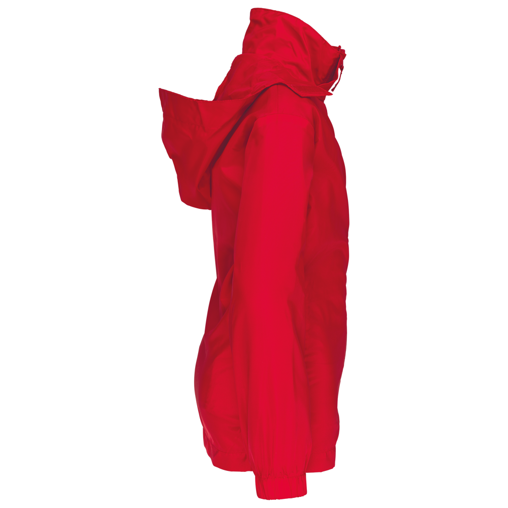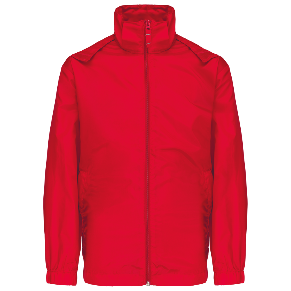 100% Poliestere. Zip frontale completa. Cappuccio nascosto con chiusura in Velcro. 2 tasche anteriori con zip. Polsini elasticizzati. Ripegabile nella sua tasca come un K-Way ®.