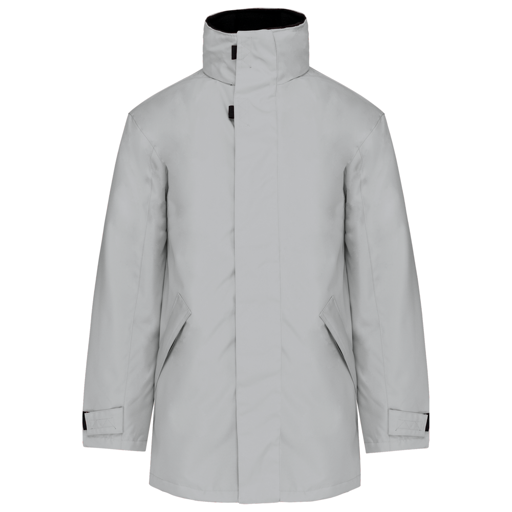 Giaccone Parka. Esterno: 100% Poliestere Oxford. Interno: Poliestere e imbottitura. 2 tasche esterne con zip. 2 tasche interne di cui una porta-cellulare. Cappuccio a scomparsa. Interno collo in Pile. Zip interna per facilitare la personalizzazione.
